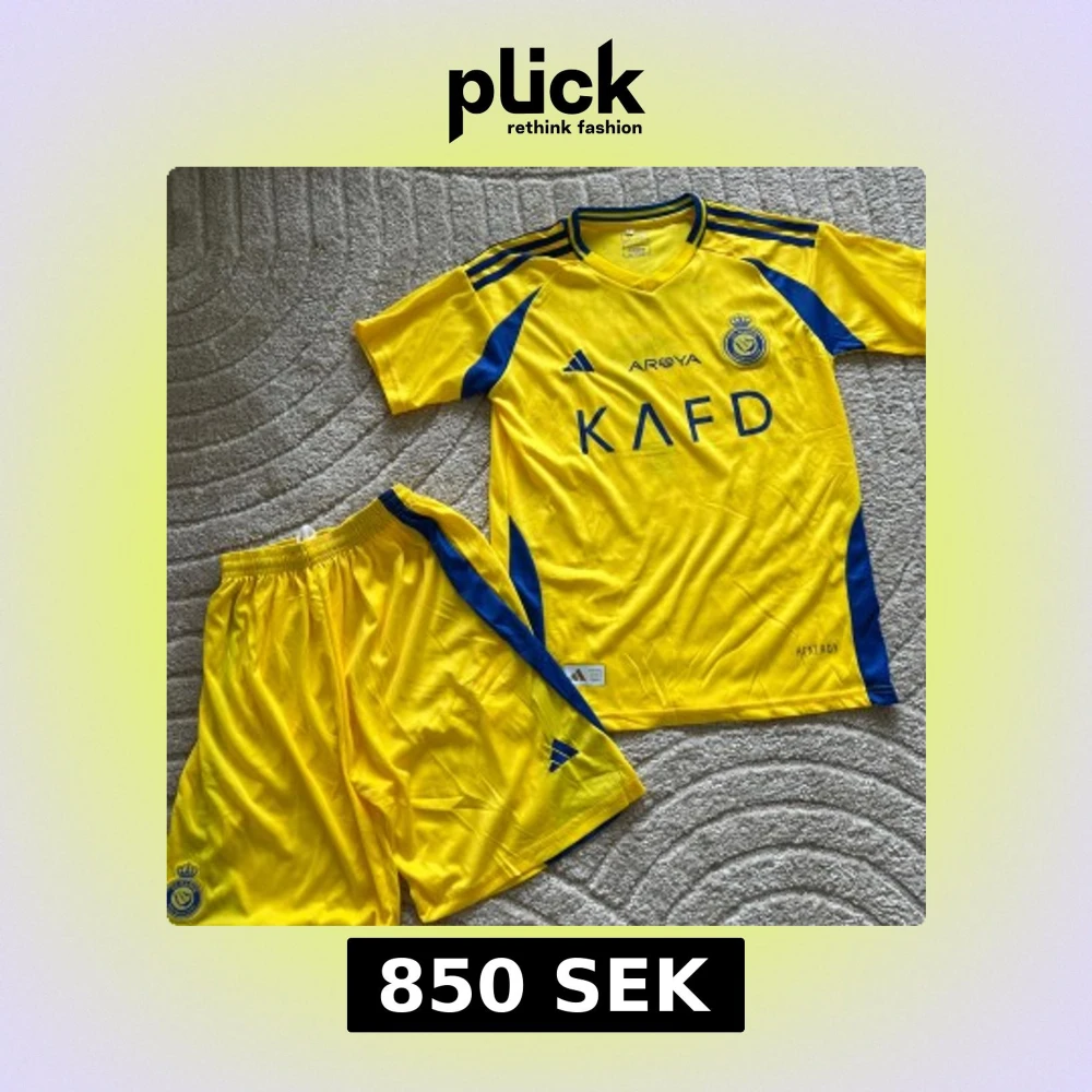 Gult och blått Al Nassr matchställ med Ronaldo 7 på ryggen. Tröjan har korta ärmar, V-ringning och klubbmärke på bröstet. Tillverkad i lätt och ventilerande polyester. Klassiska Adidas-detaljer och tryckta sponsorer framtill. Shortsen har resår i midjan och klubbmärke. Passar som S/M