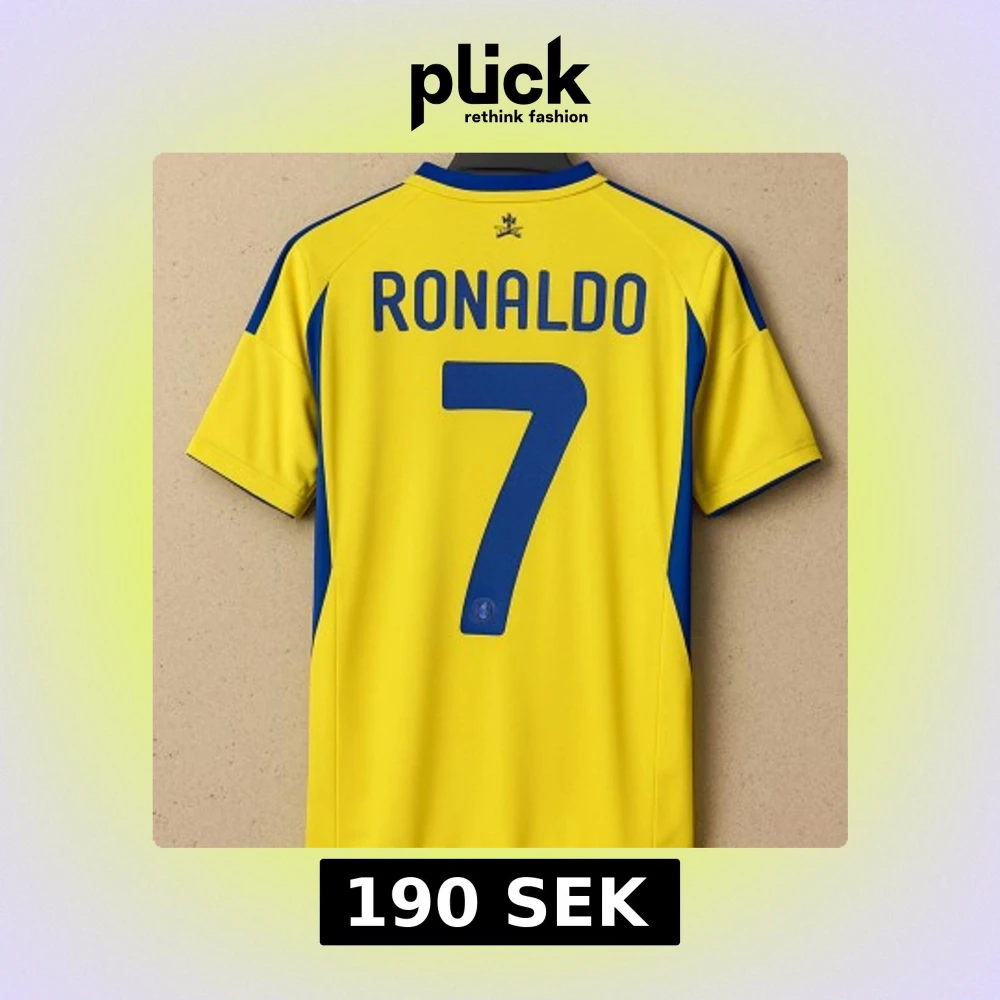 Gul och blå fotbollströja från Al Nassr med Ronaldo och nummer 7 på ryggen. Tröjan har korta ärmar, blå detaljer längs sidorna och axlarna samt klubbmärke och sponsortryck framtill. Tillverkad i lätt och ventilerande material, perfekt för fotbollsplanen.