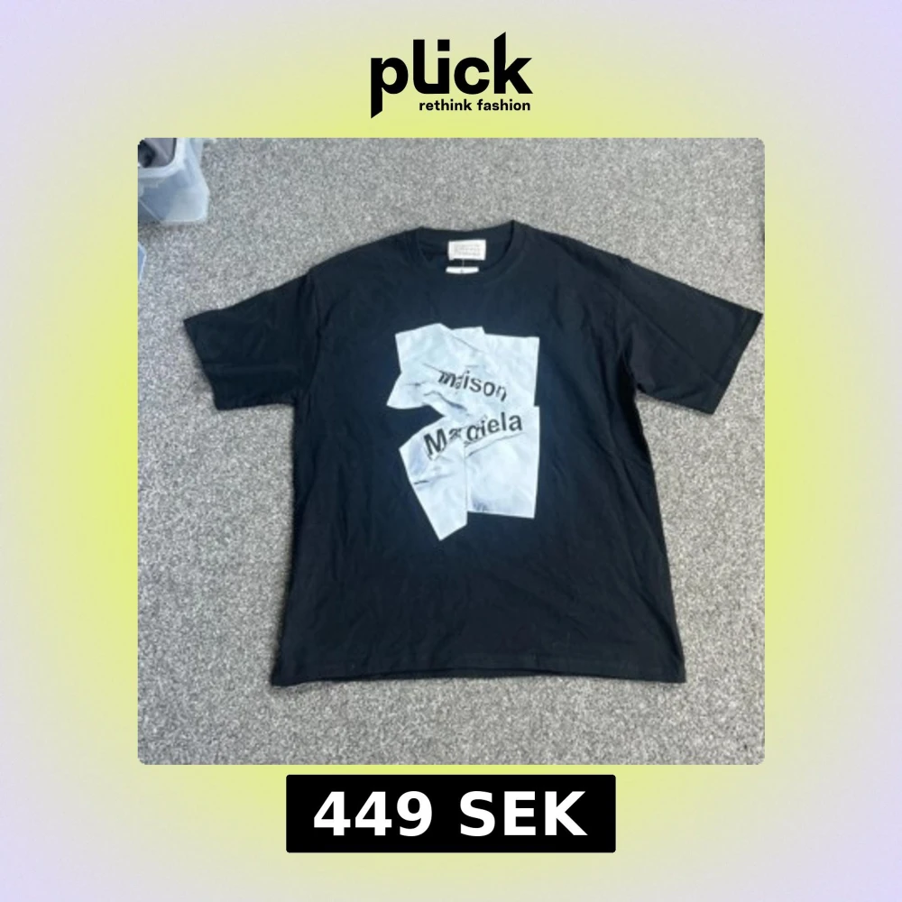 Svart t-shirt från Maison Margiela med ett stort grafiskt tryck i vitt och svart på bröstet. Storlek M. Skick 9/10