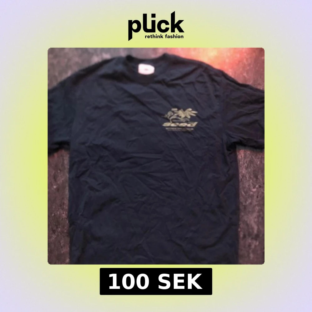 Säljer en svart t-shirt med ett coolt tryck av en blomma och texten 'seed' i beige. Perfekt för en avslappnad stil. T-shirten har korta ärmar och en normal passform.