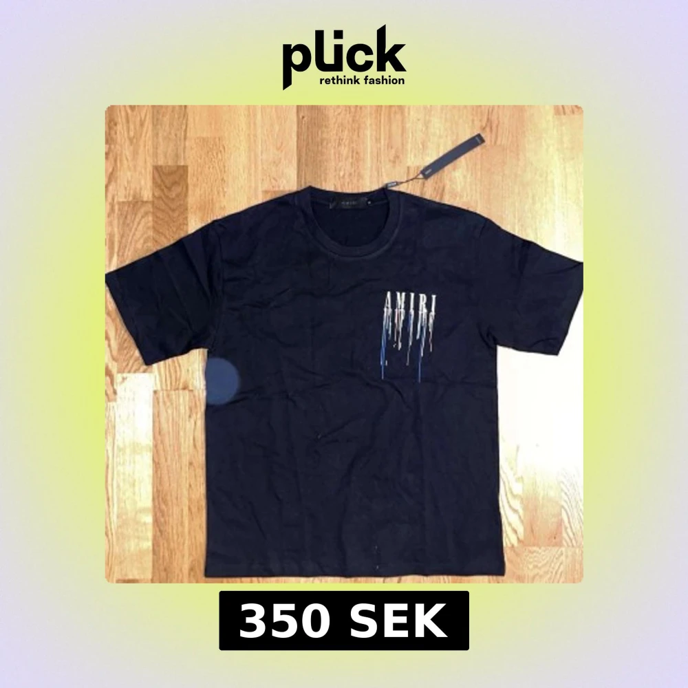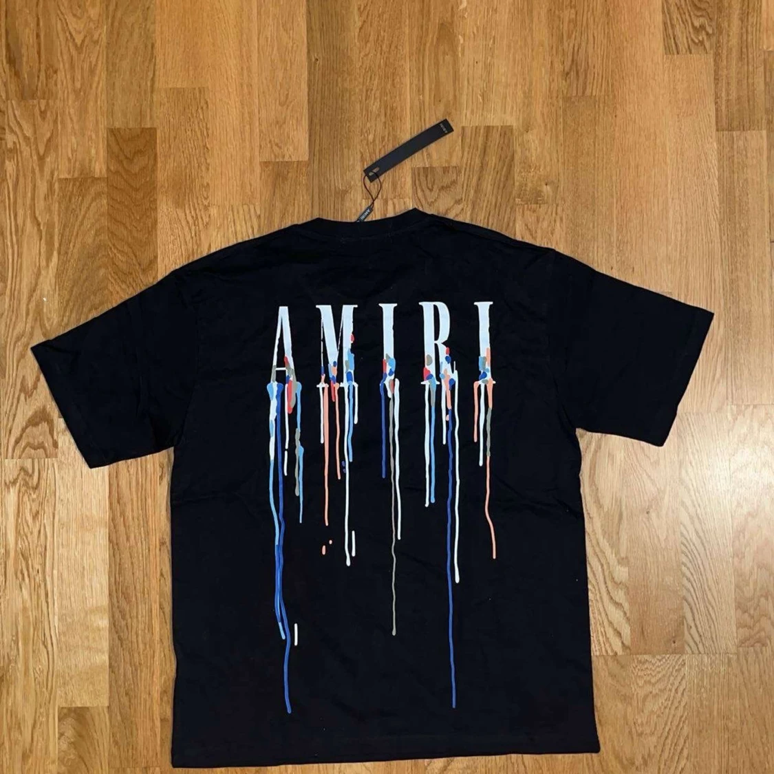 Svart t-shirt från AMIRI med stort tryck på ryggen och mindre tryck på bröstet. Trycket har en cool drip-effekt i vitt, blått och rött. Klassisk rund hals och korta ärmar. Perfekt för dig som gillar streetwear och vill sticka ut.