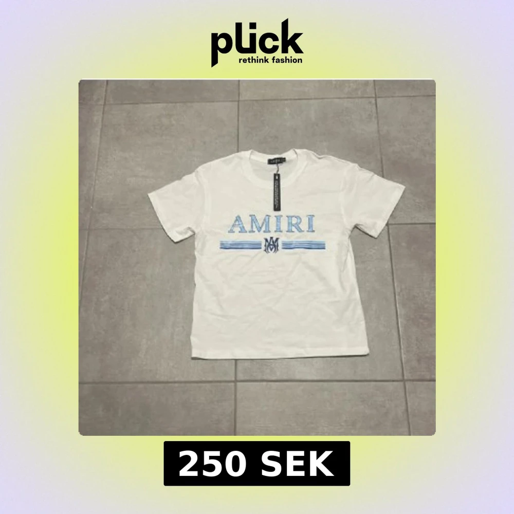 Snygg vit t-shirt från Amiri med blått logotryck och grafiska linjer på bröstet. Klassisk rund hals och korta ärmar. Perfekt för dig som gillar streetwear och vill ha en clean look med exklusiv känsla.
