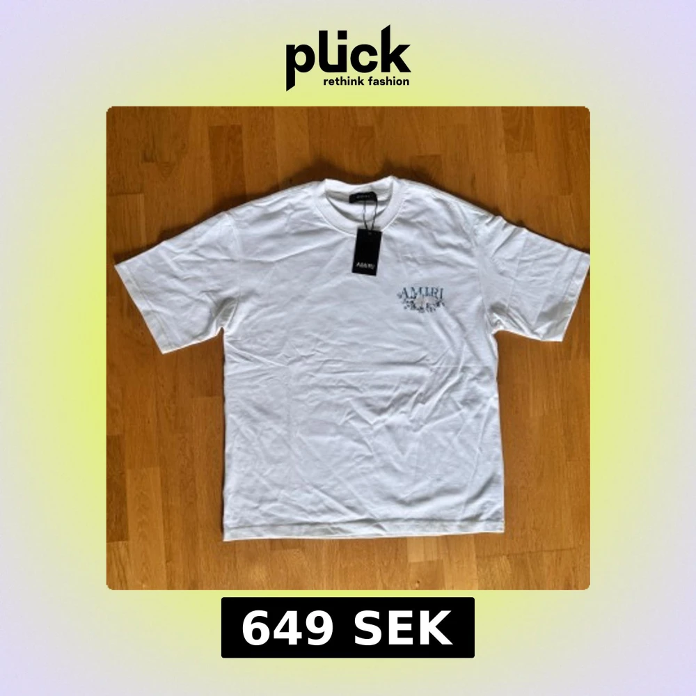 Vit t-shirt från Amiri med blått blommotiv och stor Amiri-logga på ryggen samt mindre tryck på bröstet. Klassisk passform med rund hals och korta ärmar. Tillverkad i mjuk bomull för en skön känsla.