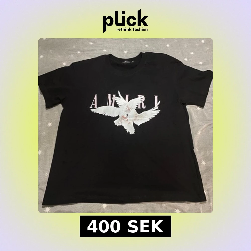 Svart t-shirt från AMIRI med stort tryck av två vita duvor och rosa bokstäver på bröstet. Klassisk passform och rund halsringning. Perfekt för dig som vill sticka ut med en snygg och modern streetstyle.