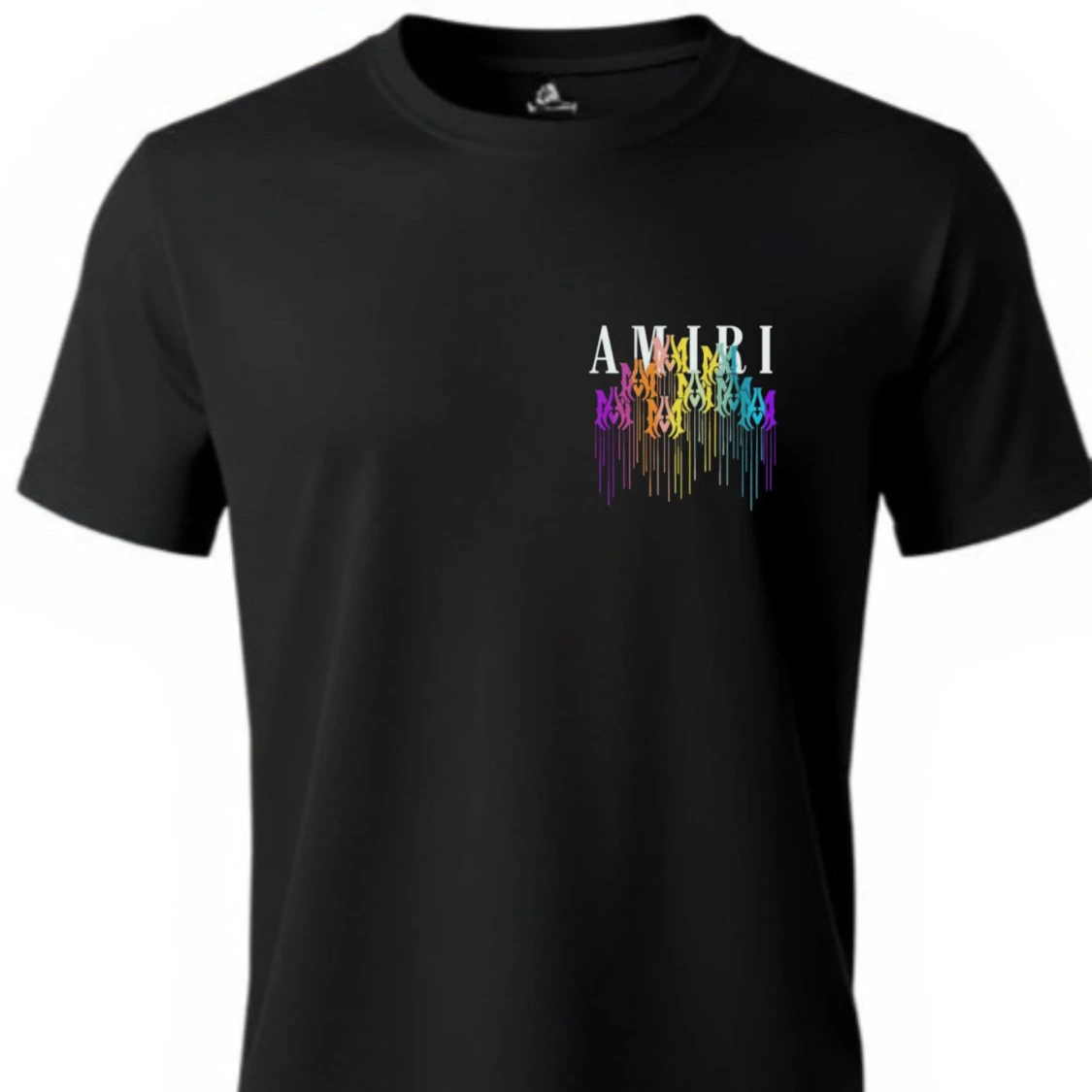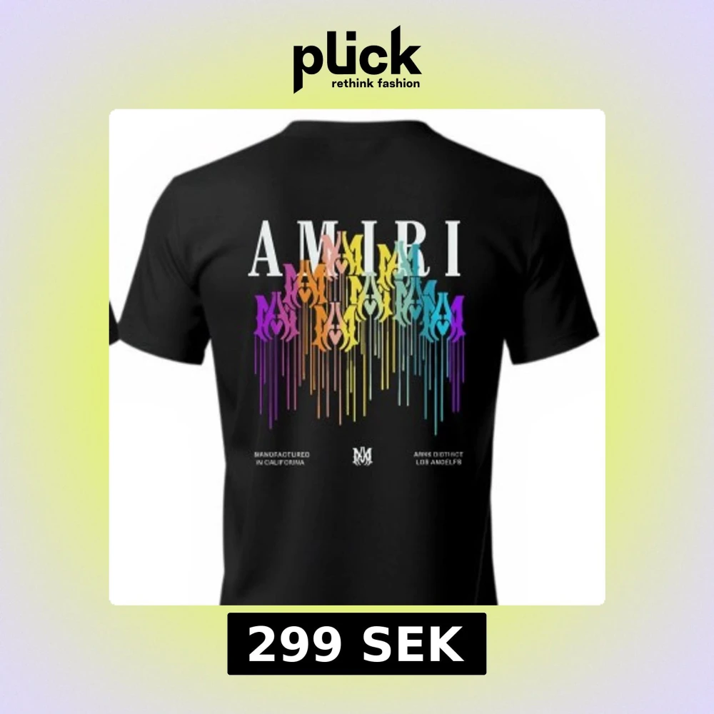 Svart t-shirt från Amiri med stort färgglatt grafiskt tryck på ryggen och mindre tryck på bröstet. T-shirten har klassisk passform, rund hals och korta ärmar. Trycket har en cool drip-effekt i lila, orange, gul, blå och turkos. Perfekt för dig som gillar streetwear vibes.