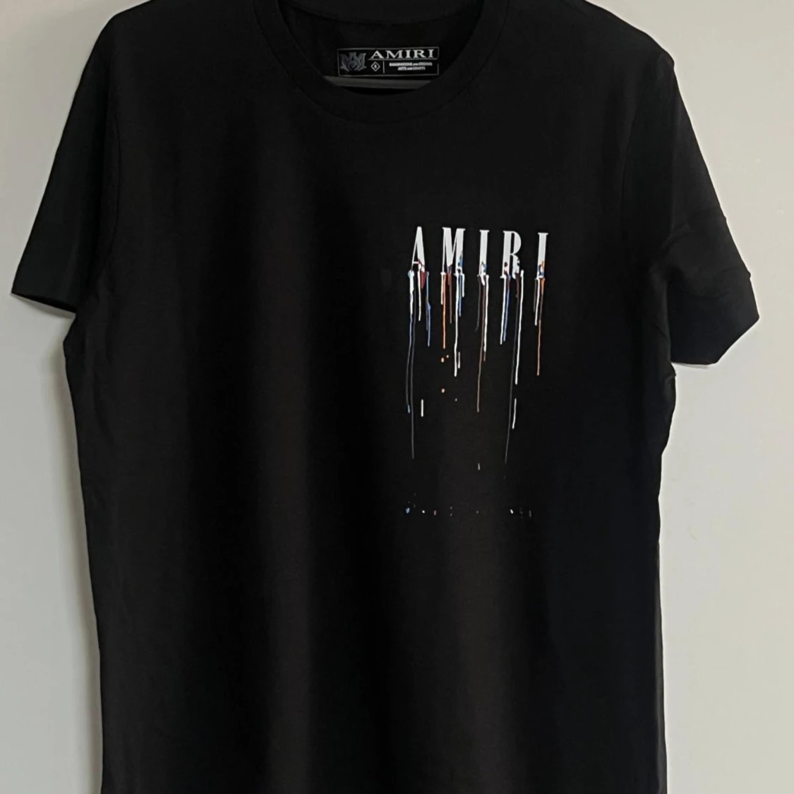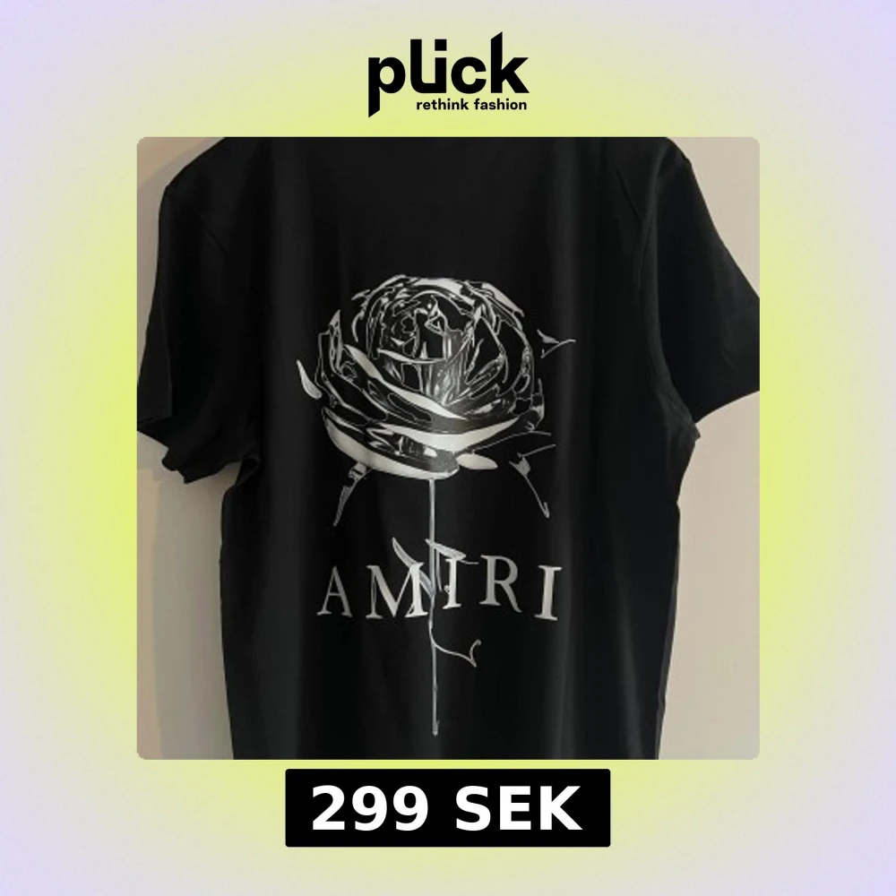 Svart t-shirt från Amiri i mjuk bomull med coolt tryck fram och bak. Framsidan har Amiri-loggan med färgstänk och baksidan har en stor silverfärgad ros och Amiri-tryck. Klassisk passform och rund hals, perfekt för en edgy streetstyle.