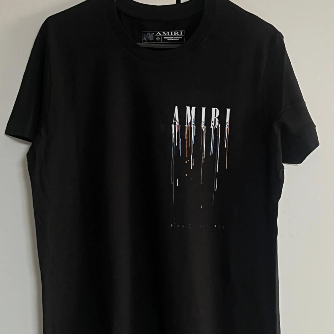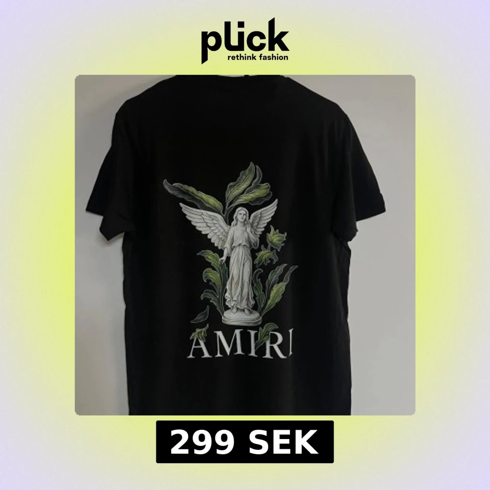 Svart t-shirt från Amiri med coolt tryck av en ängel och gröna blad på ryggen samt Amiri-logga med färgstänk på bröstet. Klassisk passform och rund halsringning. Perfekt för dig som gillar streetwear med unik design.