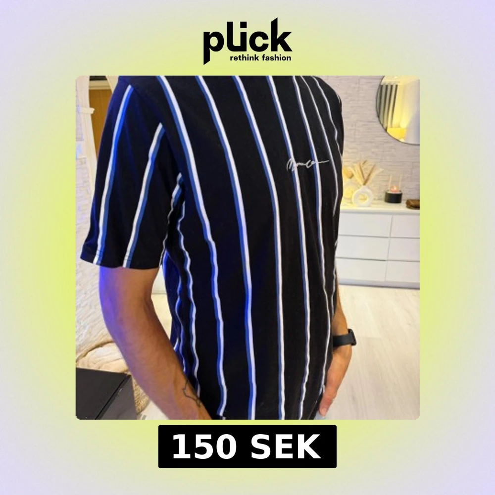 Svart t-shirt med vita och blå vertikala ränder från Mannen. Klassisk passform med korta ärmar och rund hals. Tunt och mjukt material, perfekt för en chill look. Liten vit logga broderad på bröstet. Passar bra S/M/L storlek.