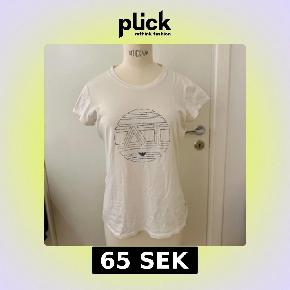 Vit t-shirt från Armani Jeans med ett AJ-mönster på framsidan i ”bling-bling”. T-shirten är kortärmad och gjord i mjukt bomullsmaterial. Perfekt för en avslappnad look till jeans. Stl står 46 men som ni ser på dambysten är t-shirten inte så stor så jag skulle säga stl 38. Hämtas på Hägerstensåsen eller ök 🤍👖