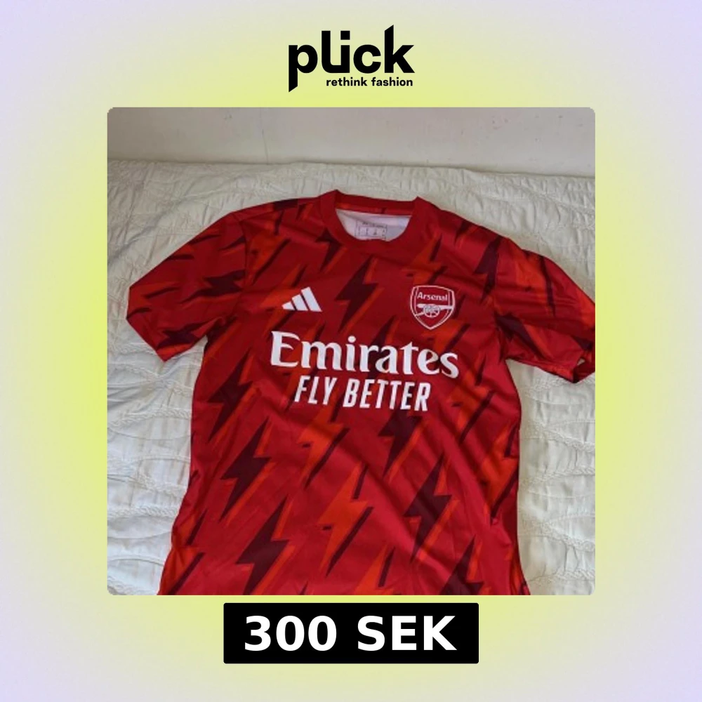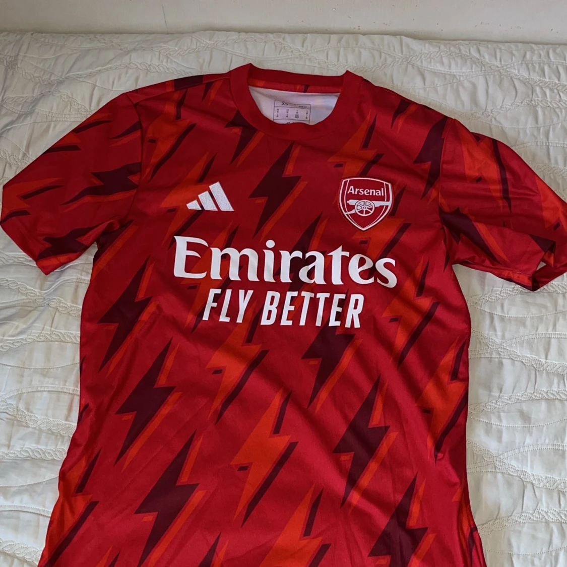 Säljer en röd Arsenal fotbollströja från Adidas med ett blixtmönster i mörkrött. Tröjan har korta ärmar och vit text med sponsorlogga på framsidan. Perfekt för alla Arsenal-fans! ⚽️