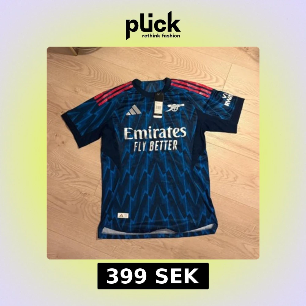 Säljer en Arsenal fotbollströja från Adidas i marinblått med blixtmönster i blå toner och röda ränder på axlarna. Tröjan har korta ärmar, rund hals och är gjord i lätt, ventilerande polyester. Tryck med Emirates Fly Better på bröstet och klubbens kanonlogga.