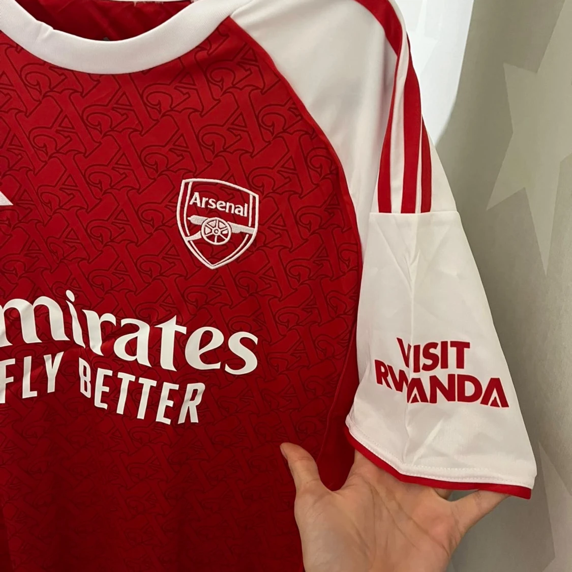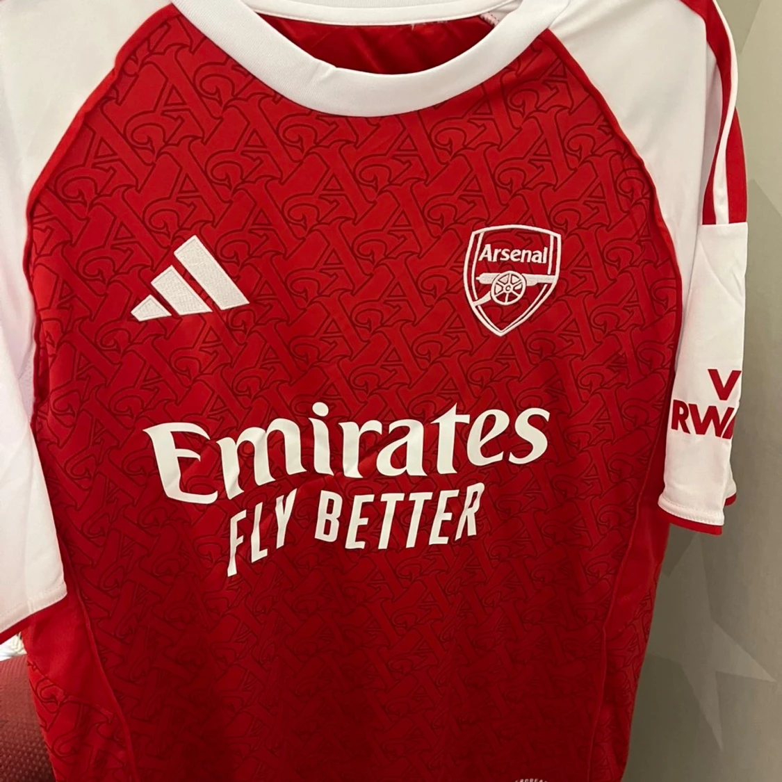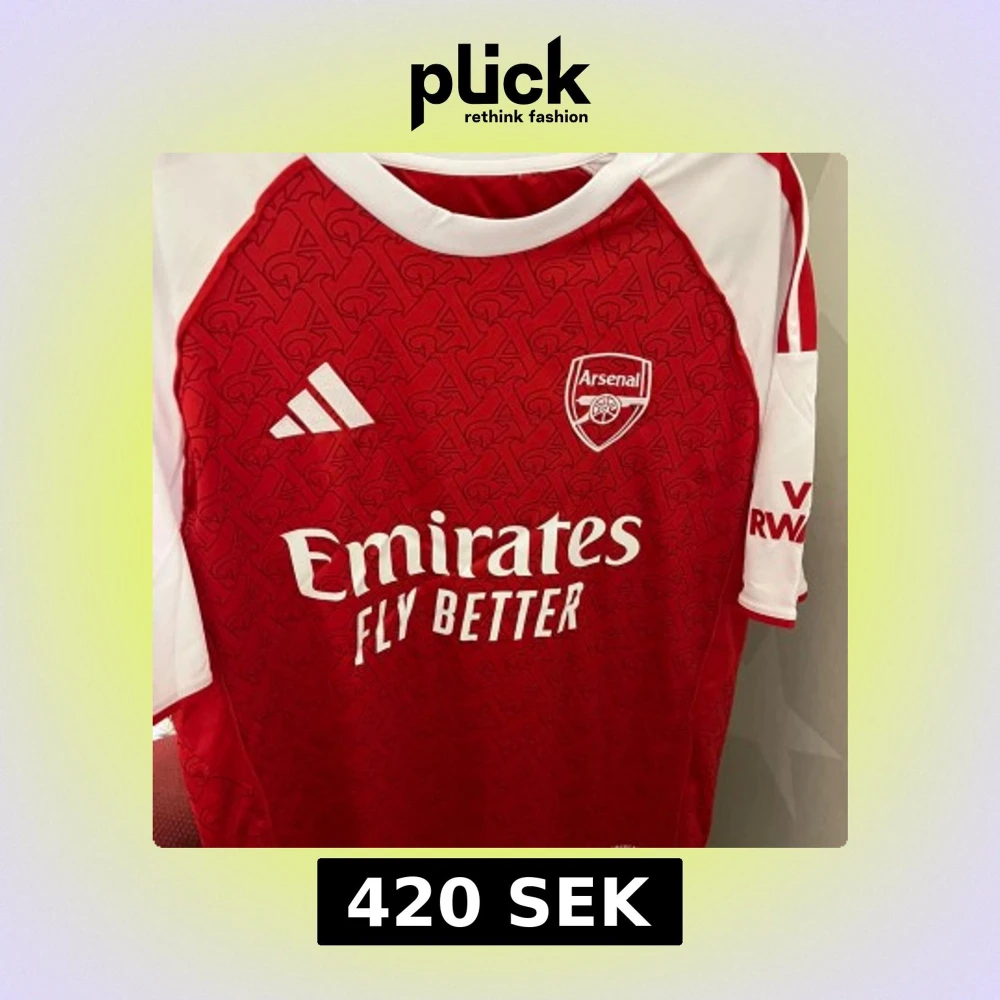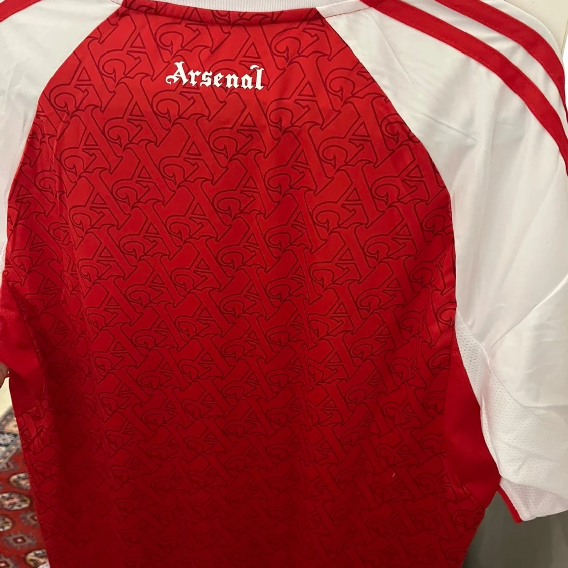 Säljer en officiell Arsenal hemmatröja från Adidas. Tröjan är röd med vita ärmar och har ett diskret mönster med bokstaven A över hela framsidan och ryggen. Klassiska Adidas-ränder på axlarna, Arsenal-logga och sponsortryck framtill. Tillverkad i lätt och ventilerande material.