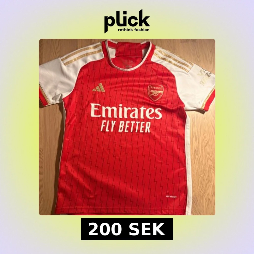Säljer en Arsenal hemmatröja från Adidas i rött och vitt med guldiga detaljer. Tröjan har korta ärmar, blixtmönster och klubbmärke på bröstet. Materialet är lätt och andas, perfekt för match eller träning. Emirates Fly Better tryck på framsidan.