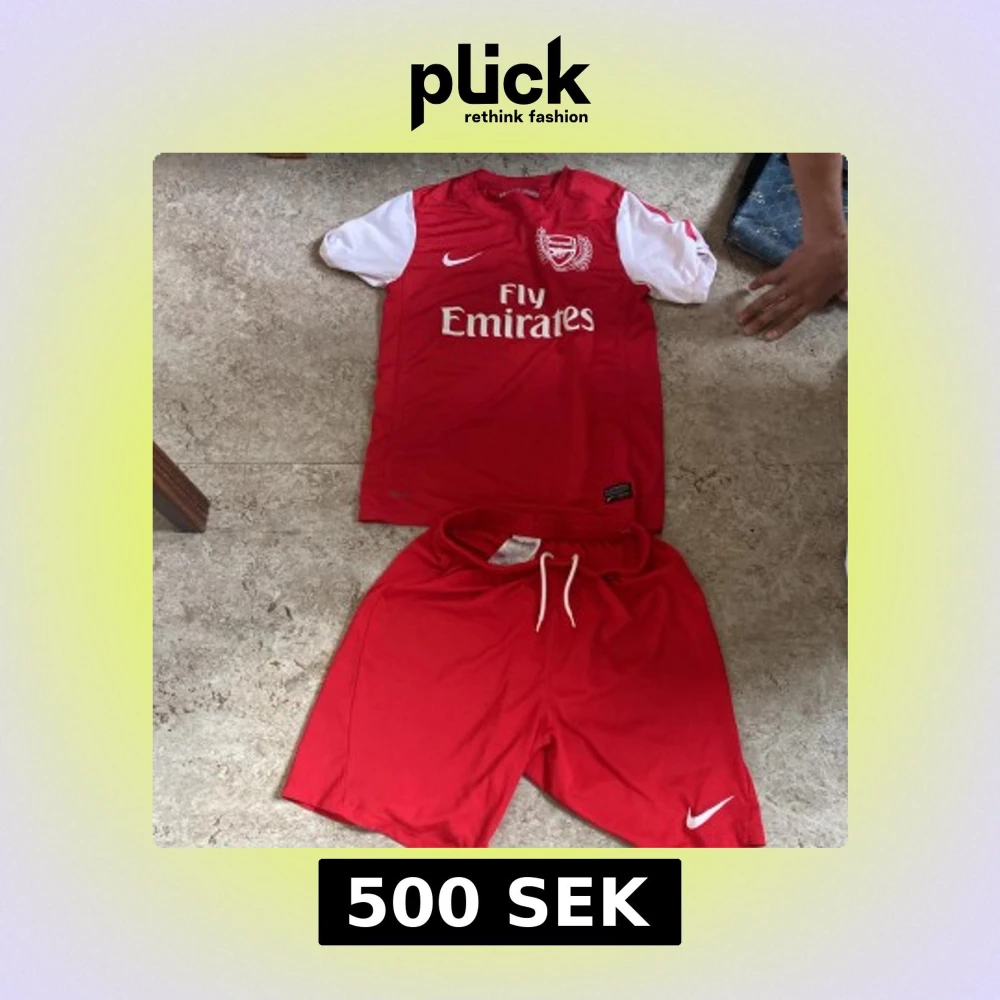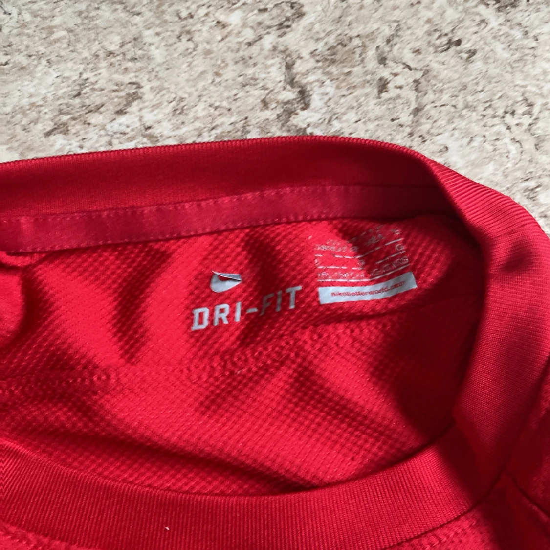 Säljer en Arsenal fotbollströja från Nike med Dri-Fit material. Tröjan är röd med vita korta ärmar, tryckt Arsenal-logga och Fly Emirates på bröstet. Passar perfekt till träning eller match. Materialet är lätt och andas, med klassisk rund hals.