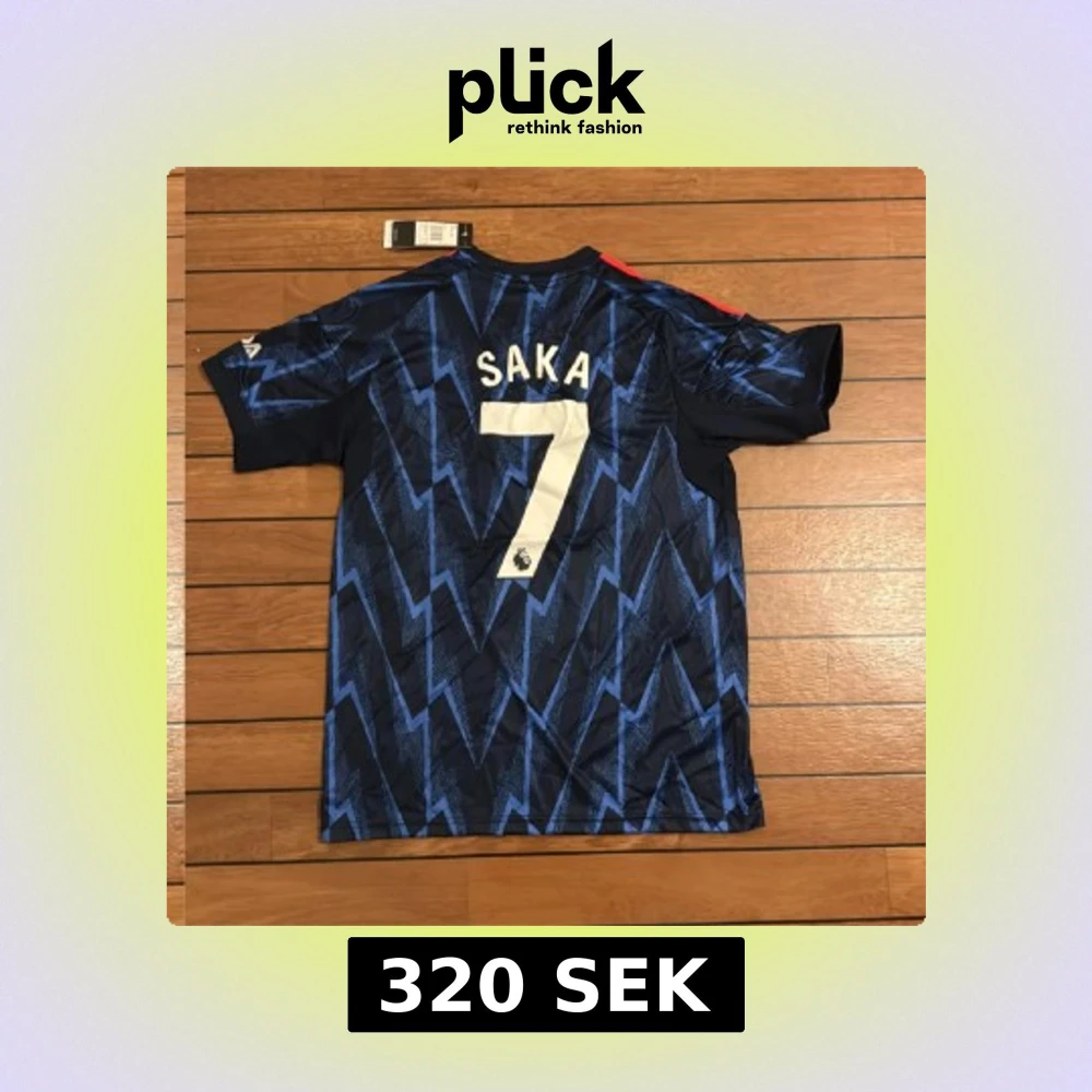 Snygg Arsenal fotbollströja från Adidas i slim fit, med Saka och nummer 7 på ryggen. Tröjan är mörkblå med ett elektriskt zigzag-mönster i blått, röda ränder på axlarna och vita tryck. Tillverkad i lätt polyester, perfekt för match eller träning.
