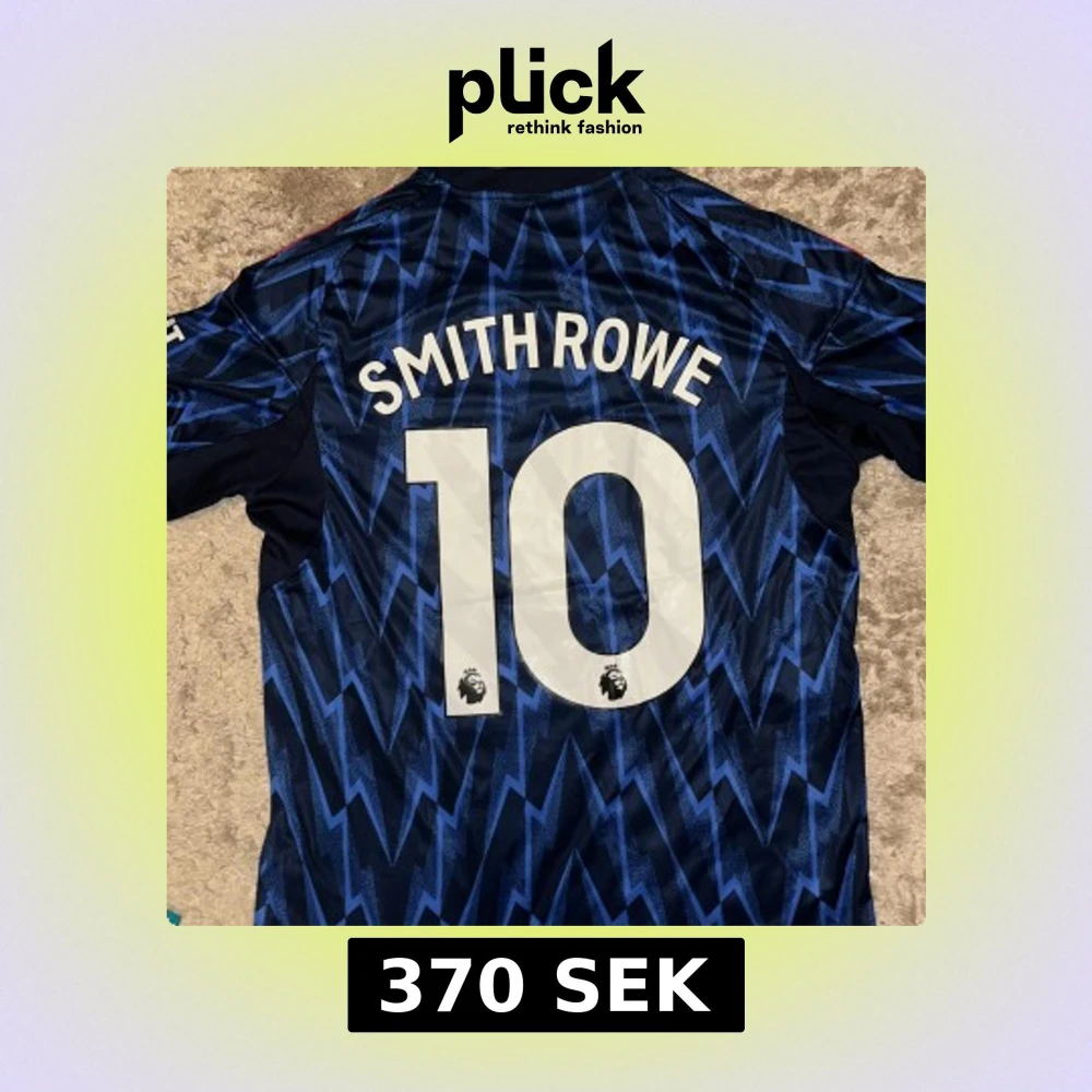 Arsenal bortatröja med Smith Rowe 10 på ryggen. Mörkblå bas med ljusblå blixtmönster, röda Adidas-ränder på axlarna och klubbmärke på bröstet. Tillverkad i lätt och ventilerande material, perfekt för match eller träning.