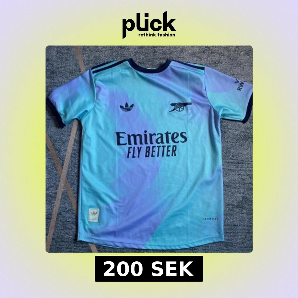 Snygg Arsenal fotbollströja från Adidas i ljusblå och lila toner. Tröjan har korta ärmar, rund hals och tryck med 'Emirates Fly Better' samt klubbens kanon-logga. Materialet är lätt och andas, perfekt för match eller träning. Klassiska Adidas-ränder på axlarna.