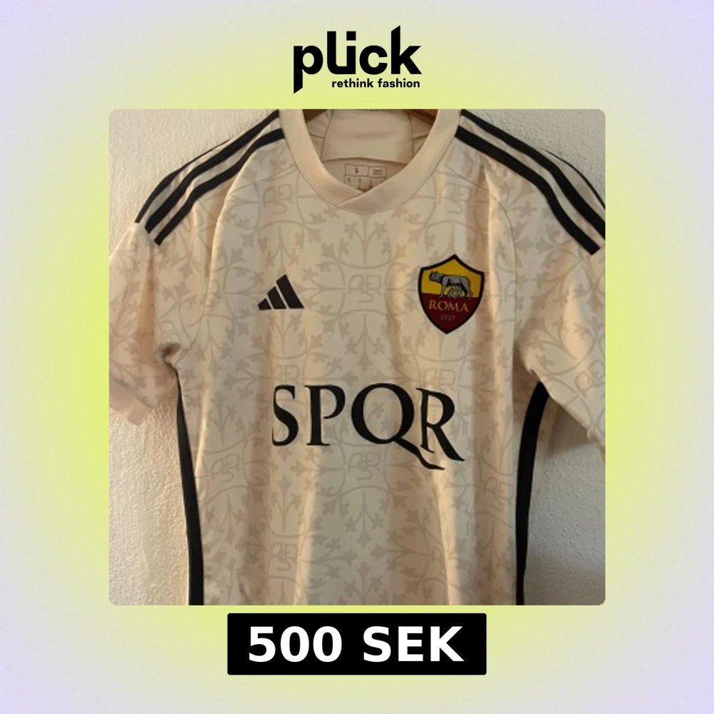 Snygg AS Roma bortatröja från Adidas i ljus beige med diskret mönster och svarta detaljer. Klassisk klubbsköld på bröstet, SPQR-tryck och svarta ränder på axlarna. Tillverkad i lätt och ventilerande material, perfekt för match eller träning.