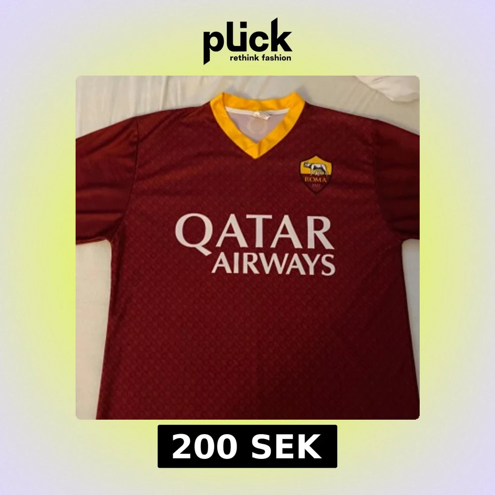 Snygg vinröd AS Roma fotbollströja med gult V-hals och klubbmärke på bröstet. Qatar Airways-logga tryckt på framsidan. Tillverkad i lätt och ventilerande material, perfekt för match eller träning.