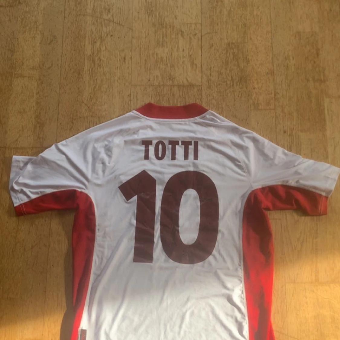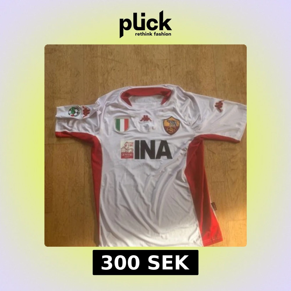 Säljer en klassisk AS Roma bortatröja från Kappa med Totti och nummer 10 på ryggen. Tröjan är vit med röda detaljer på sidor och krage, samt klubbmärke och sponsortryck på bröstet. Perfekt för dig som älskar italiensk fotboll och legenden Totti.