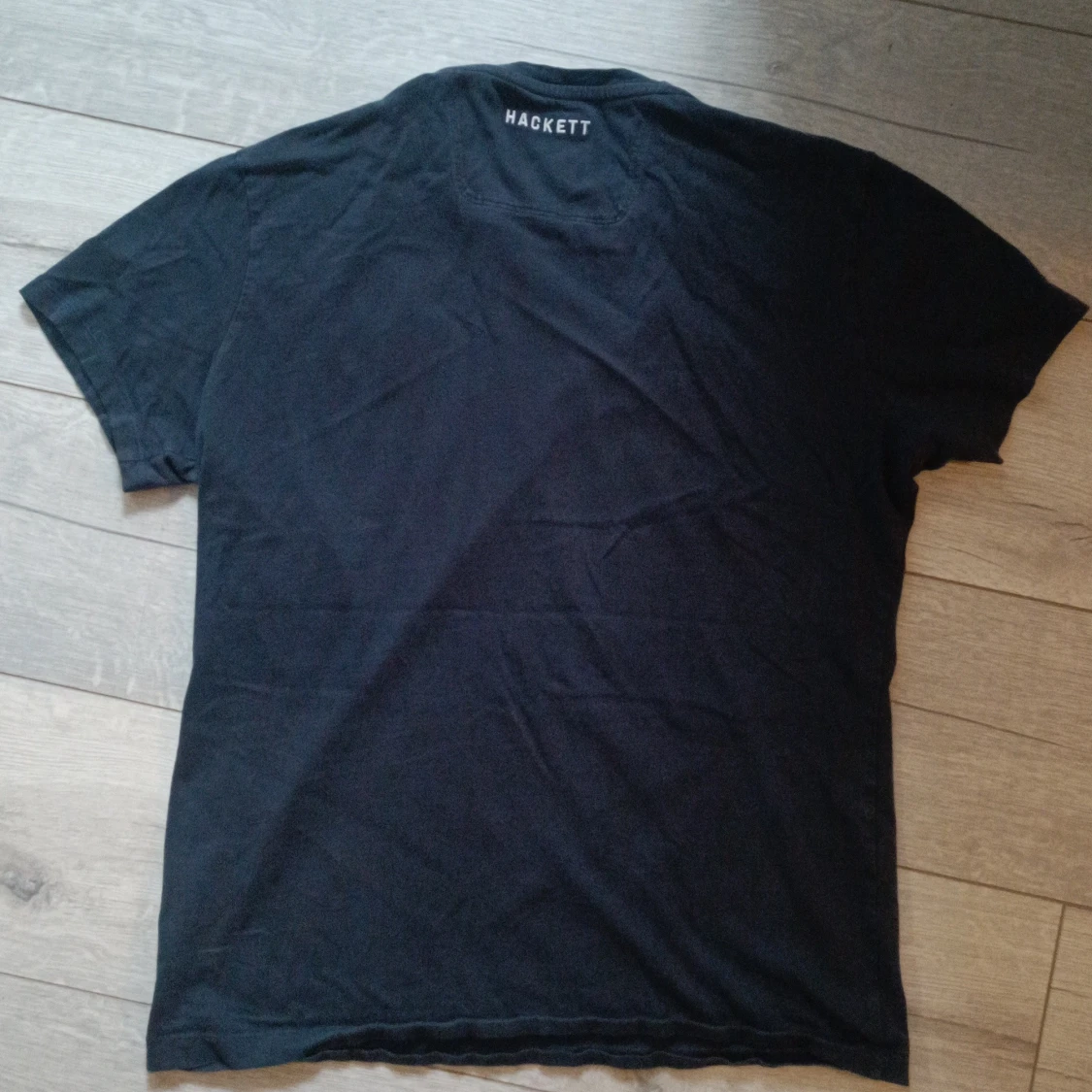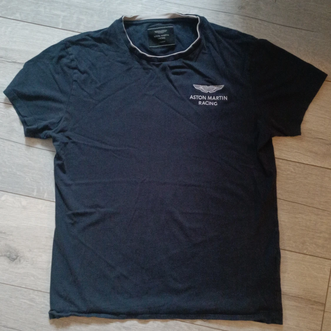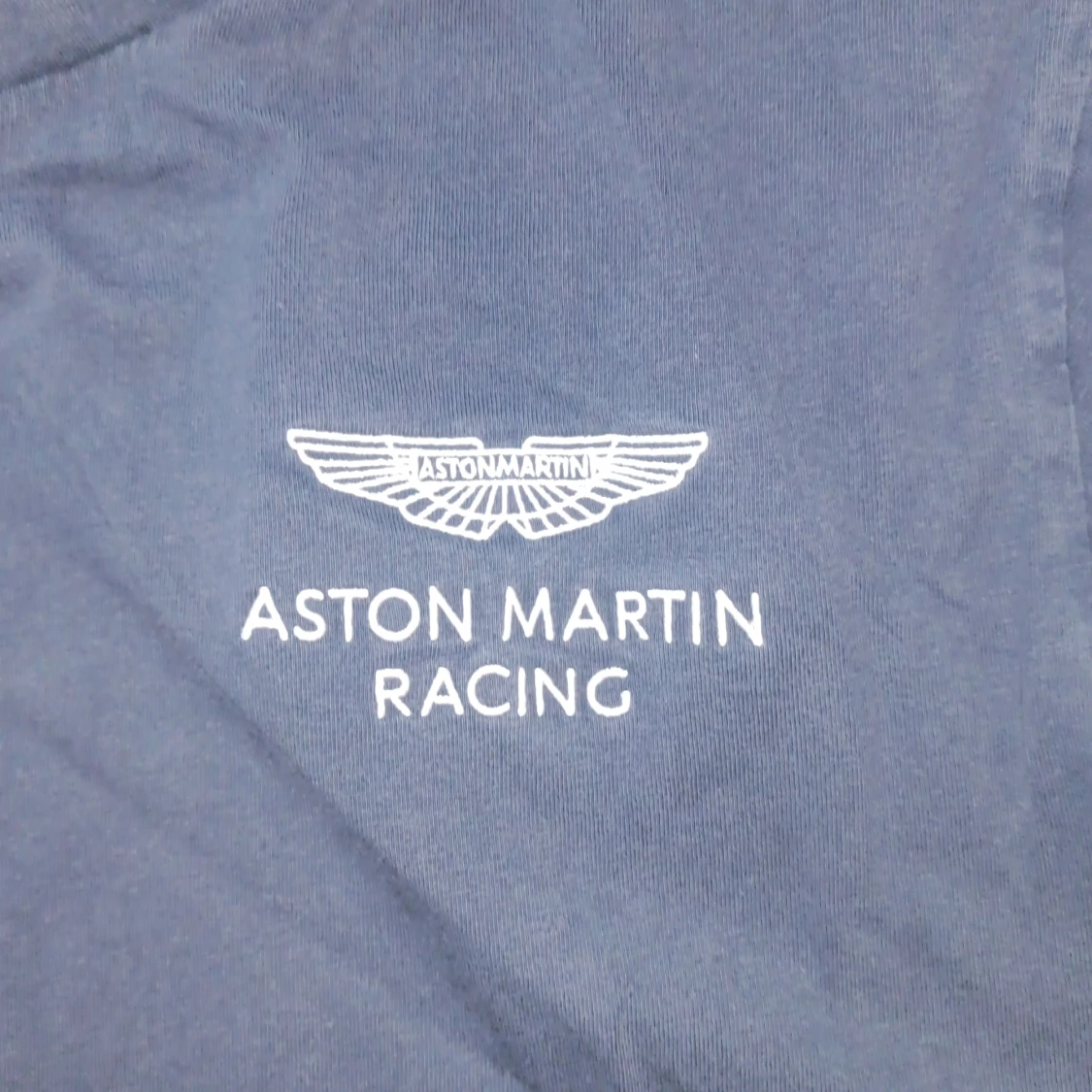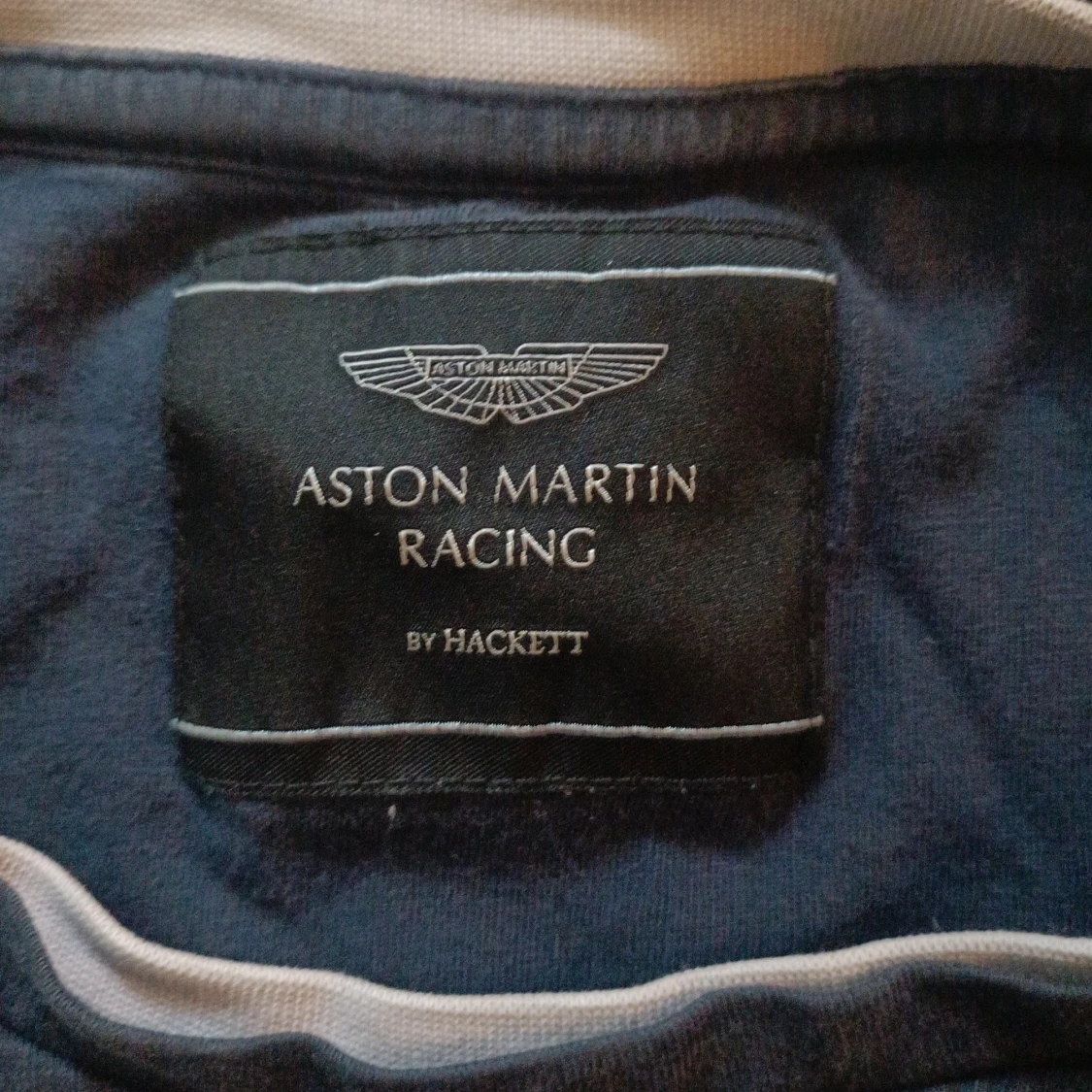 Mörkblå t-shirt från Aston Martin Racing by Hackett med vit logga tryckt på bröstet och diskret Hackett-tryck i nacken. Klassisk passform, rund hals med vit kant och korta ärmar. Perfekt för dig som gillar motorsport och stilren design.