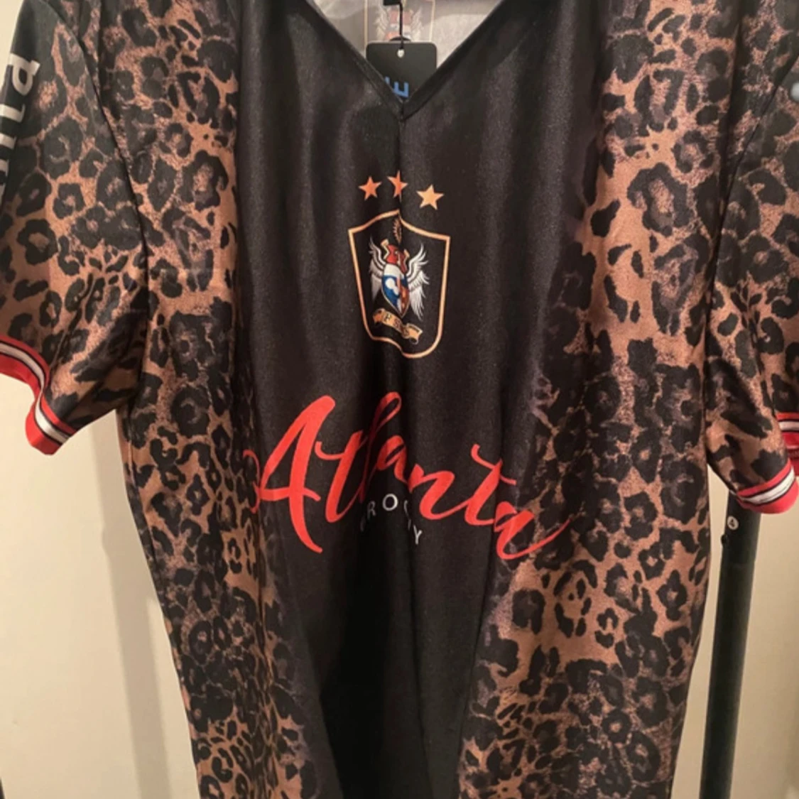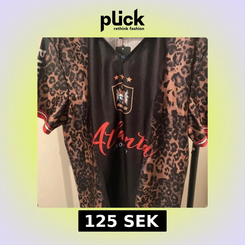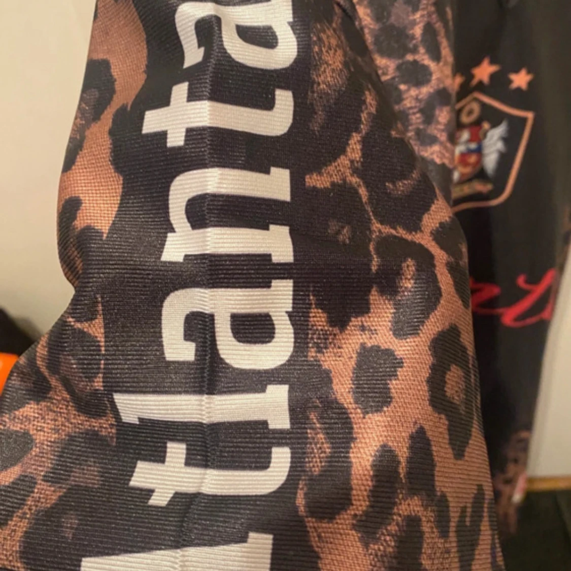 Unik tröja från ROMWE i storlek XL med svart bas och leopardmönstrade ärmar. Tryck med Atlanta Groovy och klubbmärke på bröstet. Röd text och detaljer på ärmsluten. Tillverkad i lätt och glansigt material, perfekt för dig som vill sticka ut.