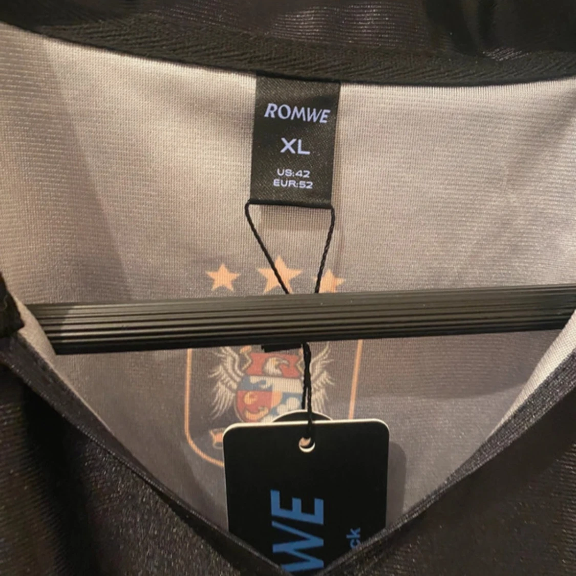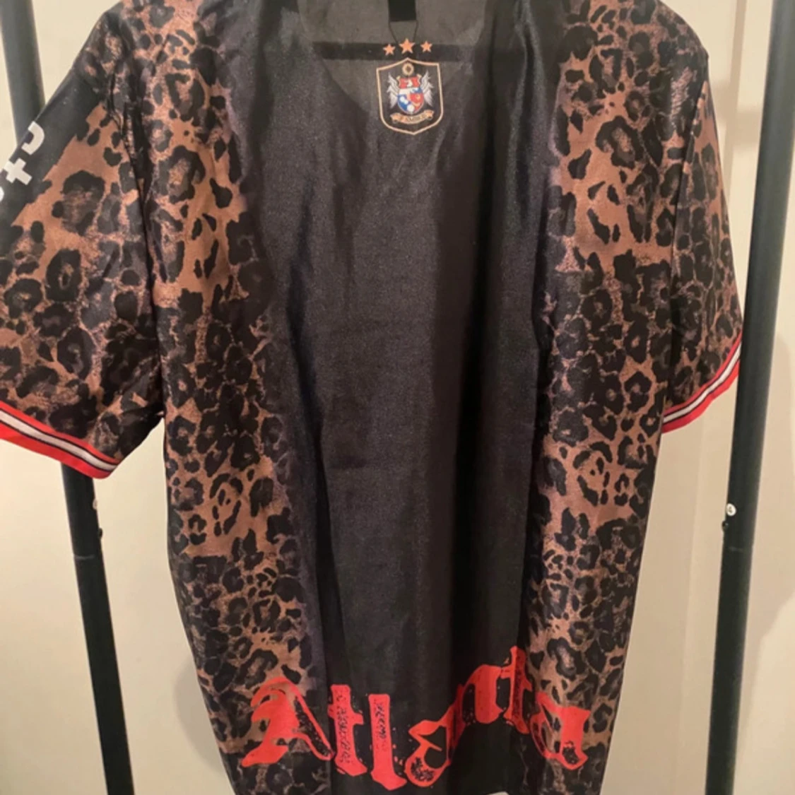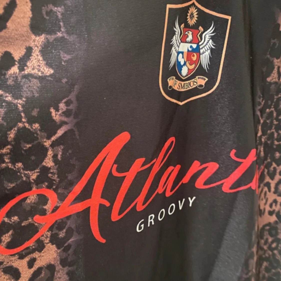 Unik tröja från ROMWE i storlek XL med svart bas och leopardmönstrade ärmar. Tryck med Atlanta Groovy och klubbmärke på bröstet. Röd text och detaljer på ärmsluten. Tillverkad i lätt och glansigt material, perfekt för dig som vill sticka ut.