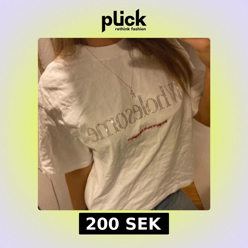 Säljer en vit t-shirt från Axel Arigato med texten 'Wholesome' i glittriga stenar på framsidan. Nypris 400kr