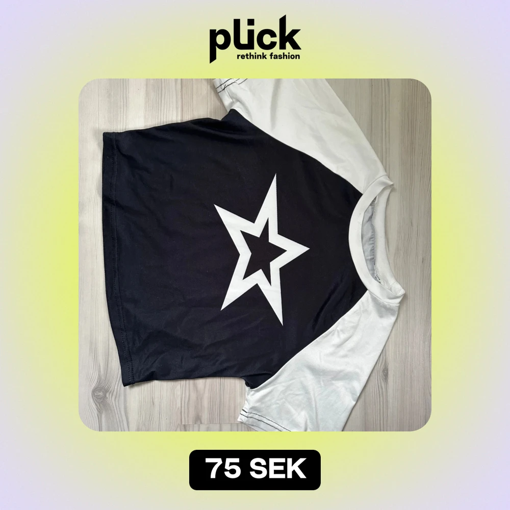 Säljer en svart och vit crop top med en stor vit stjärna på framsidan. Den har korta ärmar och är mjuk och tun. Passar bra till både jeans och shorts. Perfekt för en chill festkväll! Skriv gärna om du är intresserad innan du köper! 🫶