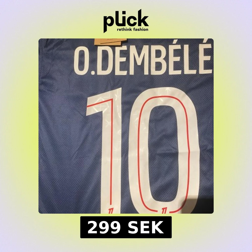 Säljer en Paris Saint-Germain fotbollströja med O. Dembélé och nummer 10 på ryggen. Tröjan är marinblå med geometriskt mönster i rött och vitt, PSG-emblem på bröstet och Qatar Airways som sponsor. Tillverkad i lätt Dri-Fit material för bästa komfort.