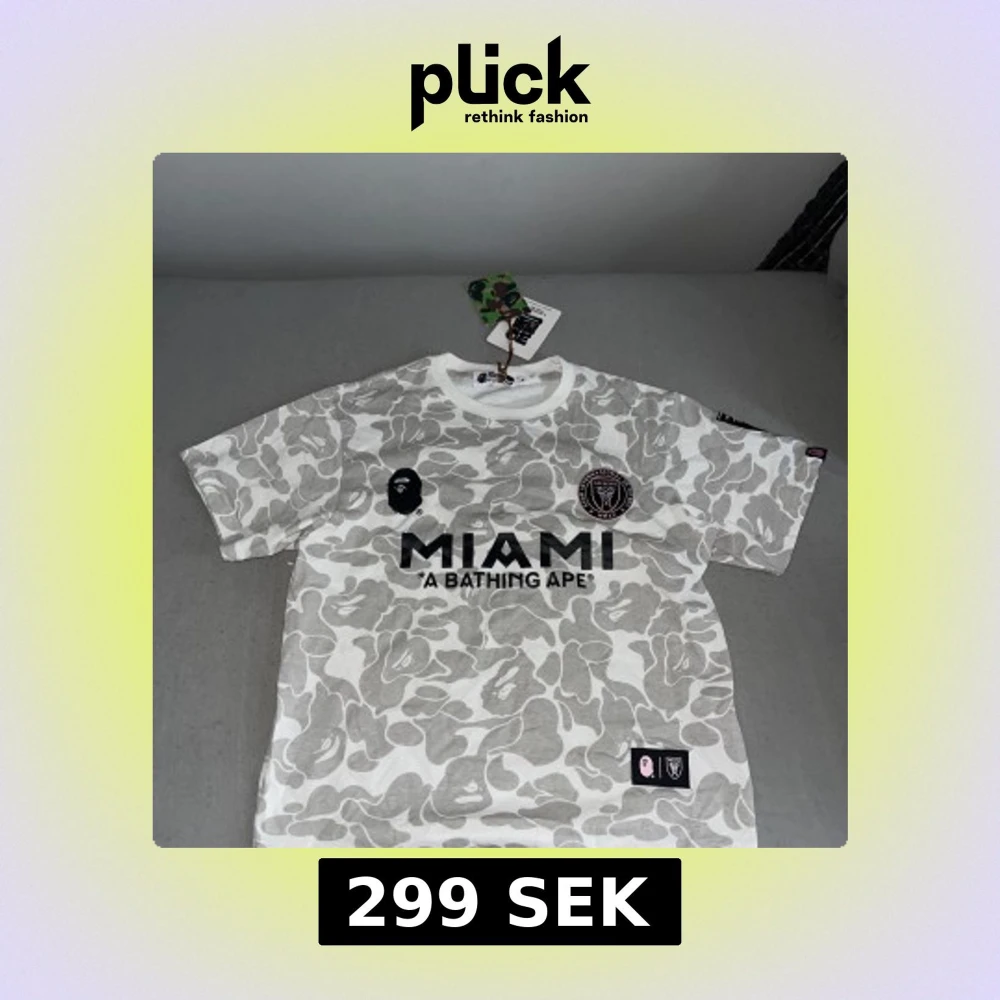 Snygg t-shirt från BAPE i samarbete med Inter Miami. T-shirten har grått och vitt camouflagemönster, tryck med MIAMI och BAPE 93, samt broderade patches. Klassisk passform och tillverkad i mjuk bomull. Perfekt för dig som gillar streetwear och fotboll.