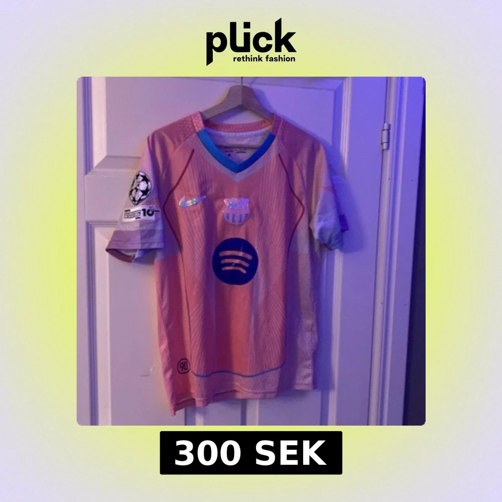 Säljer en Barcelona fotbollströja med Lamine Yamal och nummer 10 på ryggen. Tröjan är rosa med blå detaljer, har korta ärmar och V-ringad krage med turkos kant. Officiella Nike-loggan, Spotify sponsor och Champions League-märke på ärmen. Materialet är lätt polyester.