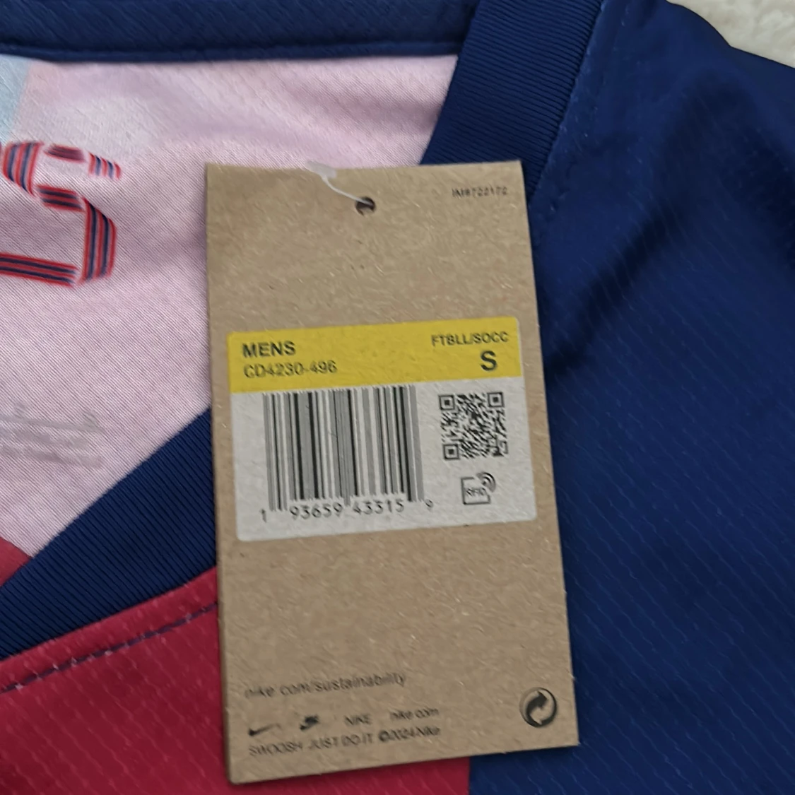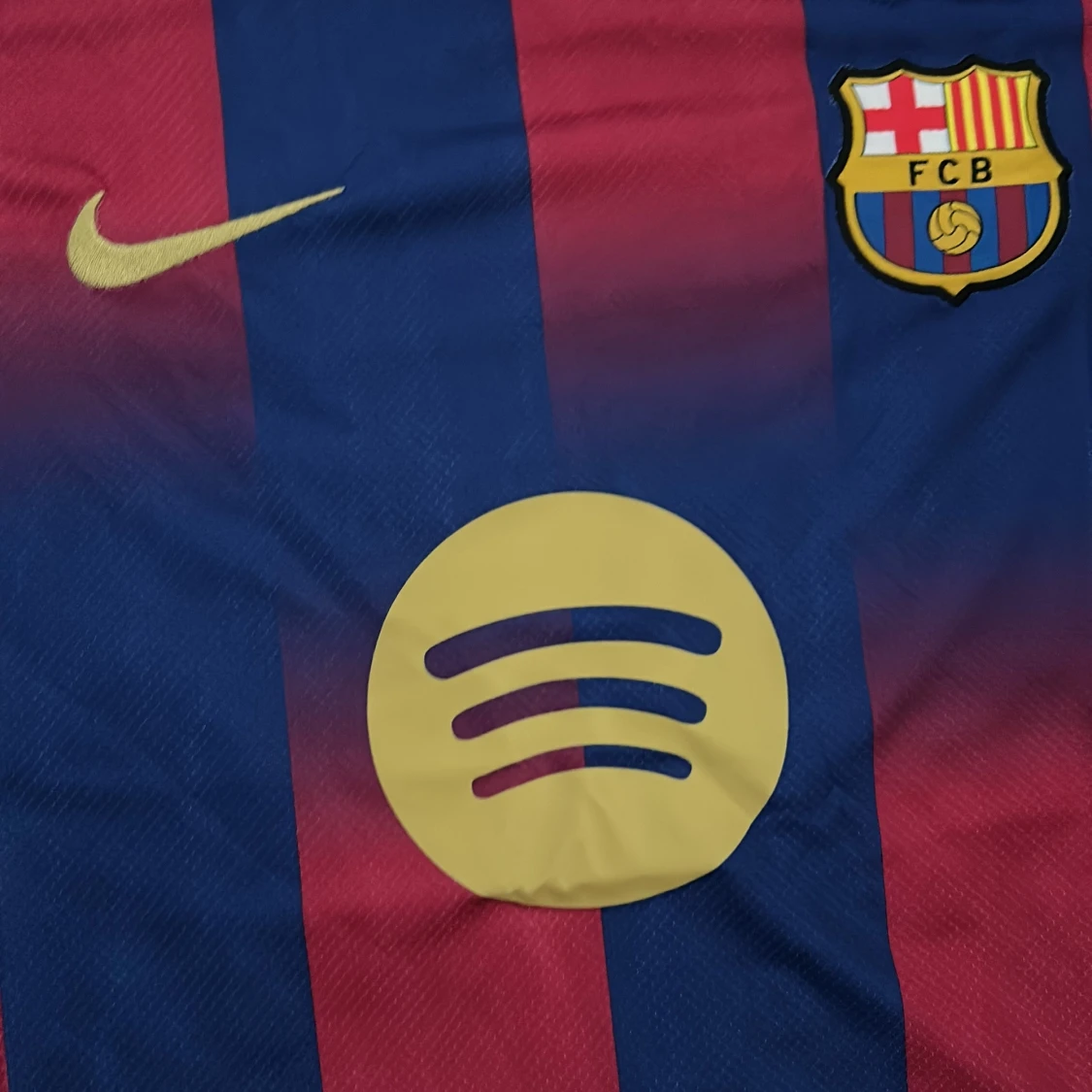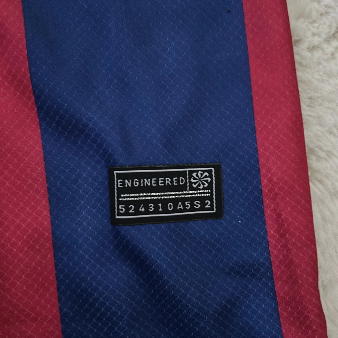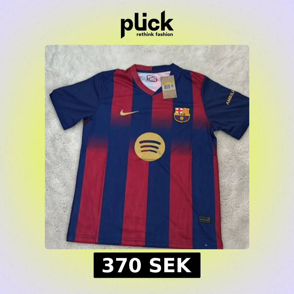 Barcelona fotbollströja från Nike i storlek S. Tröjan har klassiska blå och röda vertikala ränder, guldiga detaljer som Nike-logga och Spotify-logga på bröstet samt klubbmärket. Tillverkad i lätt polyester med korta ärmar och V-ringad krage.