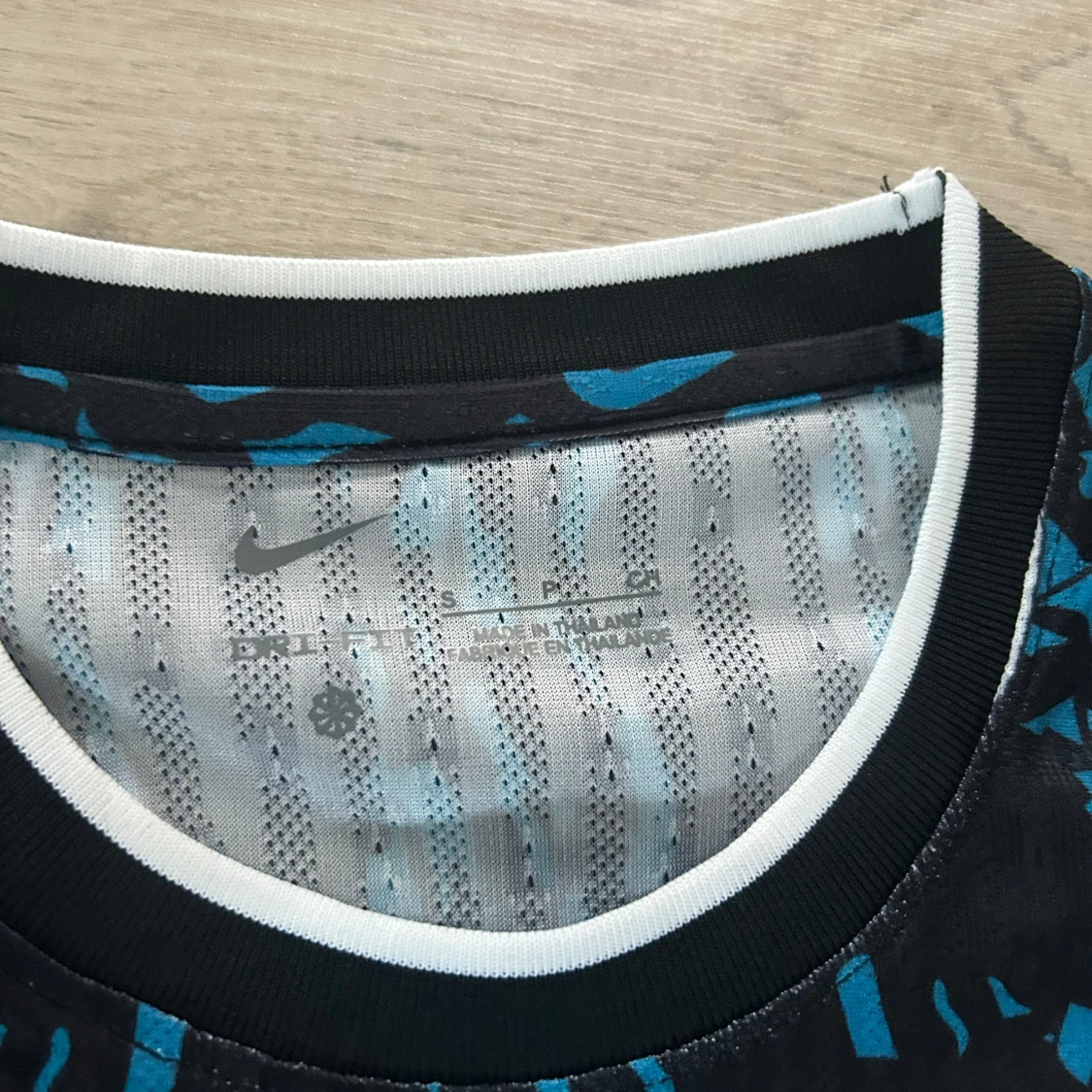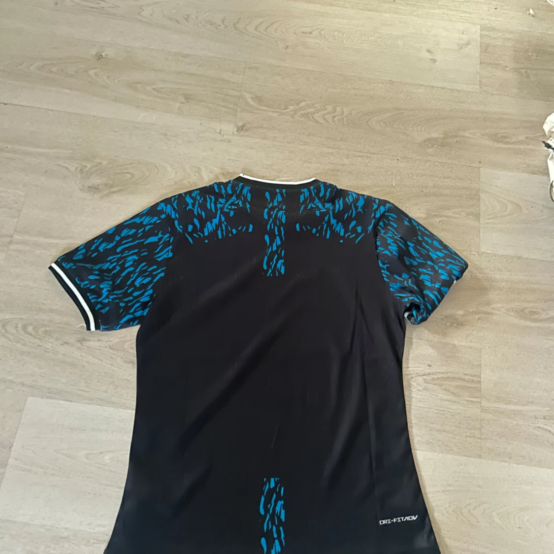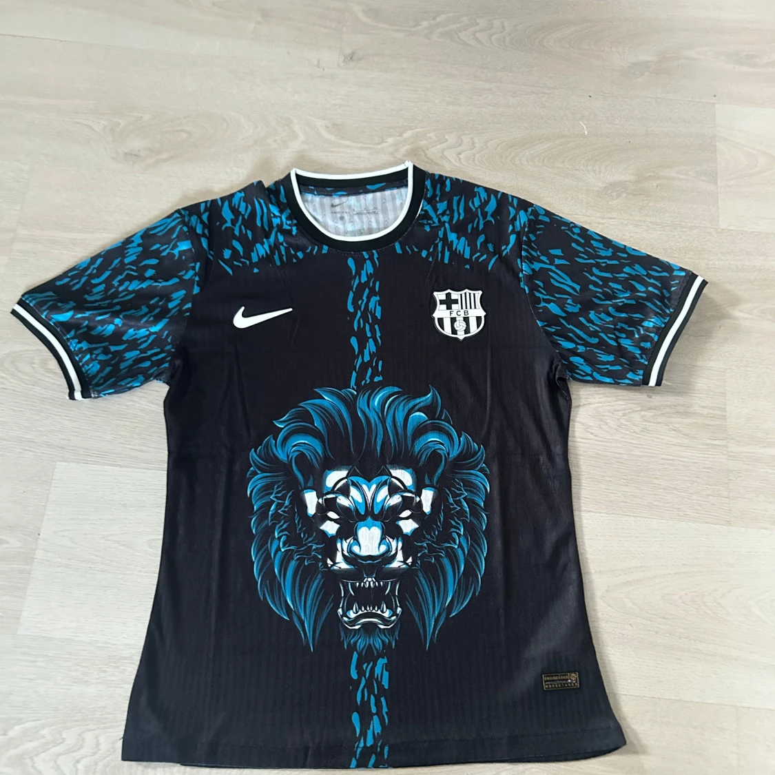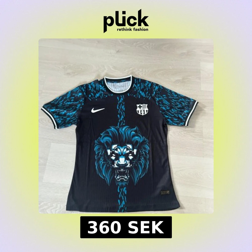 Säljer en svart kortärmad Barcelona fotbollströja med blått lejonmotiv på framsidan och blått mönster på axlarna. Tröjan har vit och svart ribbad krage och klubbmärke på bröstet.