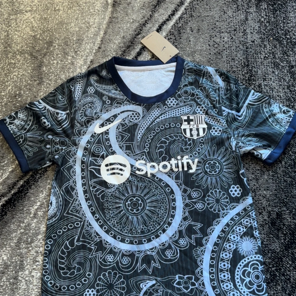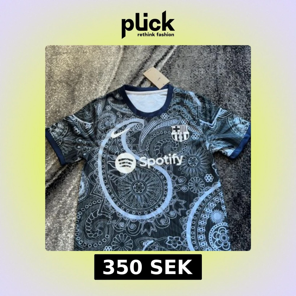 Säljer en Barcelona fotbollströja med Spotify-logga och paisleymönster i vitt och ljusblått på svart botten. Tröjan har korta ärmar och rund halsringning med mörkblå kant. Perfekt för dig som vill sticka ut på planen eller läktaren.