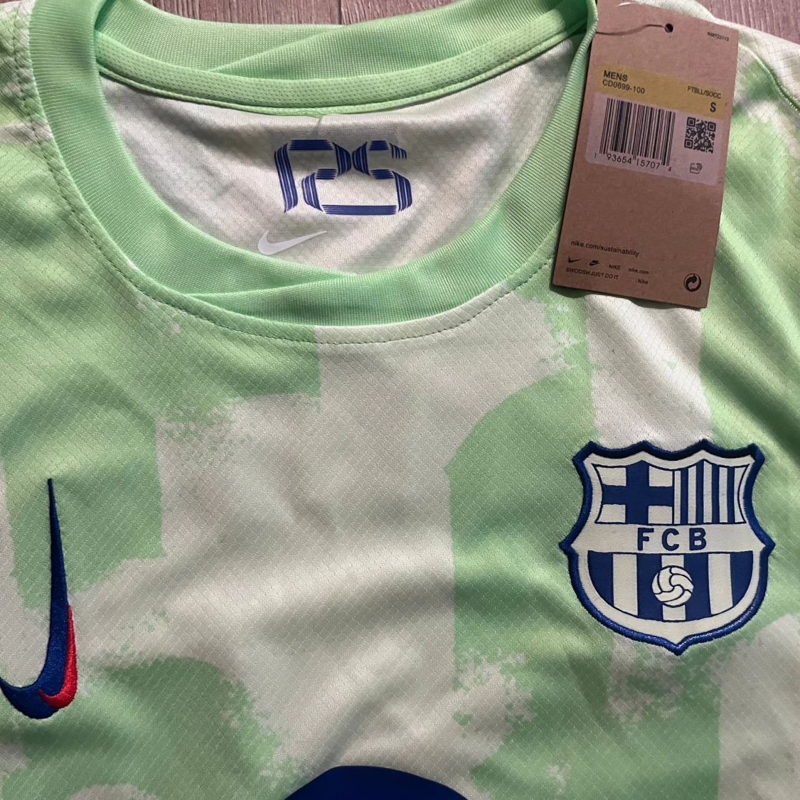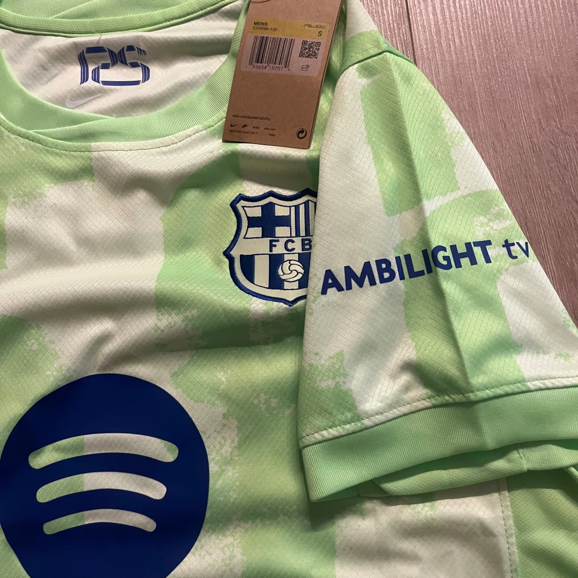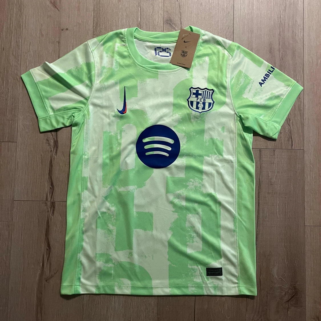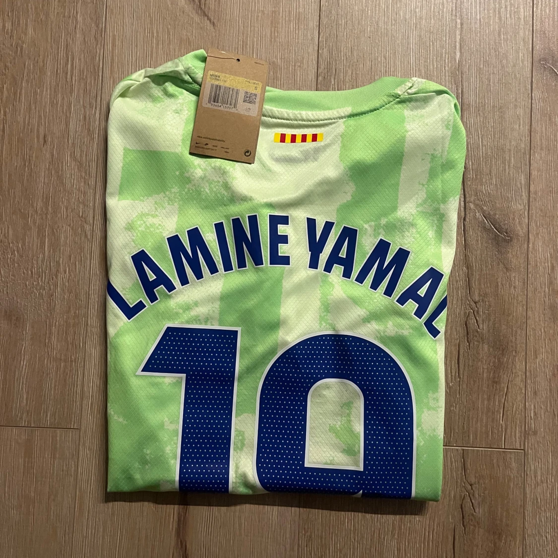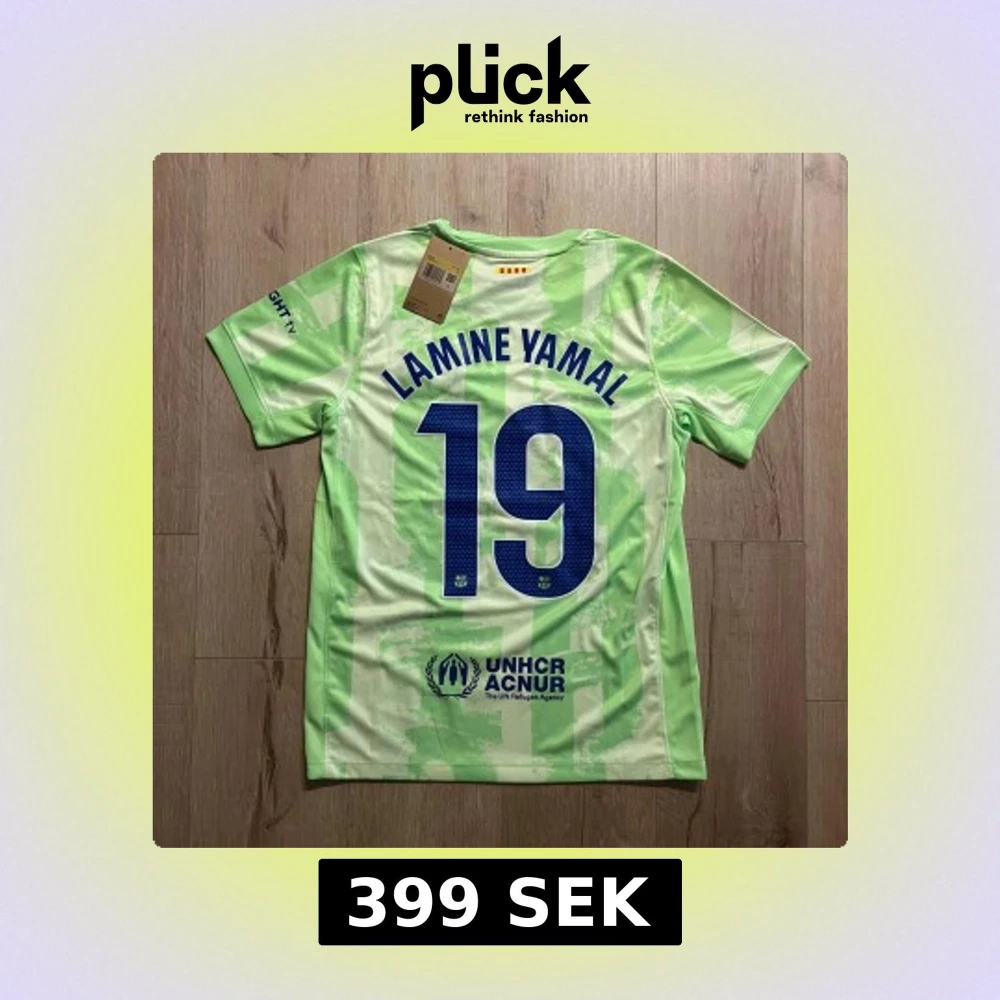 Säljer en officiell FC Barcelona fotbollströja med Lamine Yamal och nummer 19 på ryggen. Tröjan är ljusgrön med vita och gröna grafiska mönster, korta ärmar och rund hals. Märkt med Nike-logga, Spotify och UNHCR tryck samt FCB klubbmärke. Tillverkad i lätt polyester.