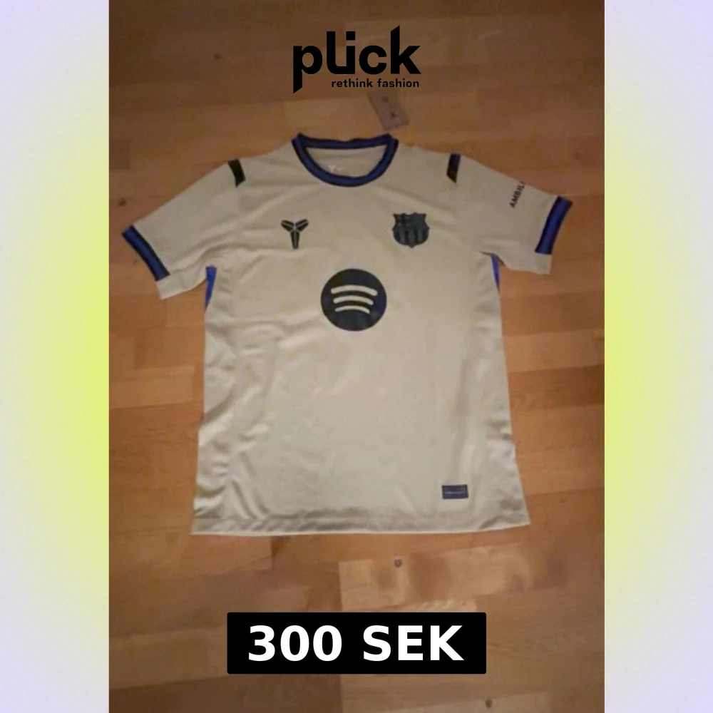 Säljer en beige FC Barcelona fotbollströja med Lamine Yamal och nummer 10 på ryggen. Tröjan är kortärmad, har blå och svarta detaljer vid krage och ärmslut, samt tryck från Spotify och UNHCR. Materialet är lätt och andas, Dri-Fit teknologi för extra komfort.