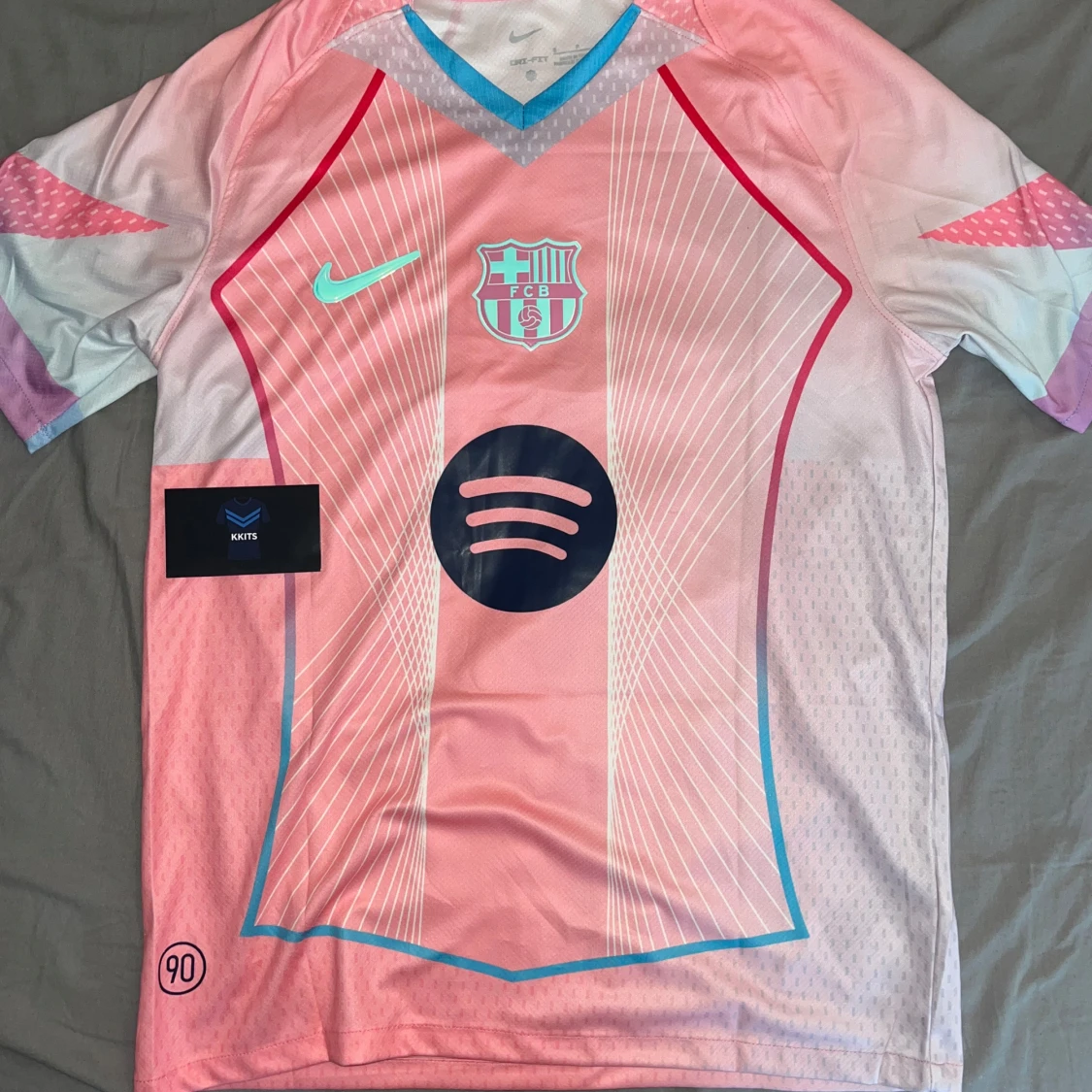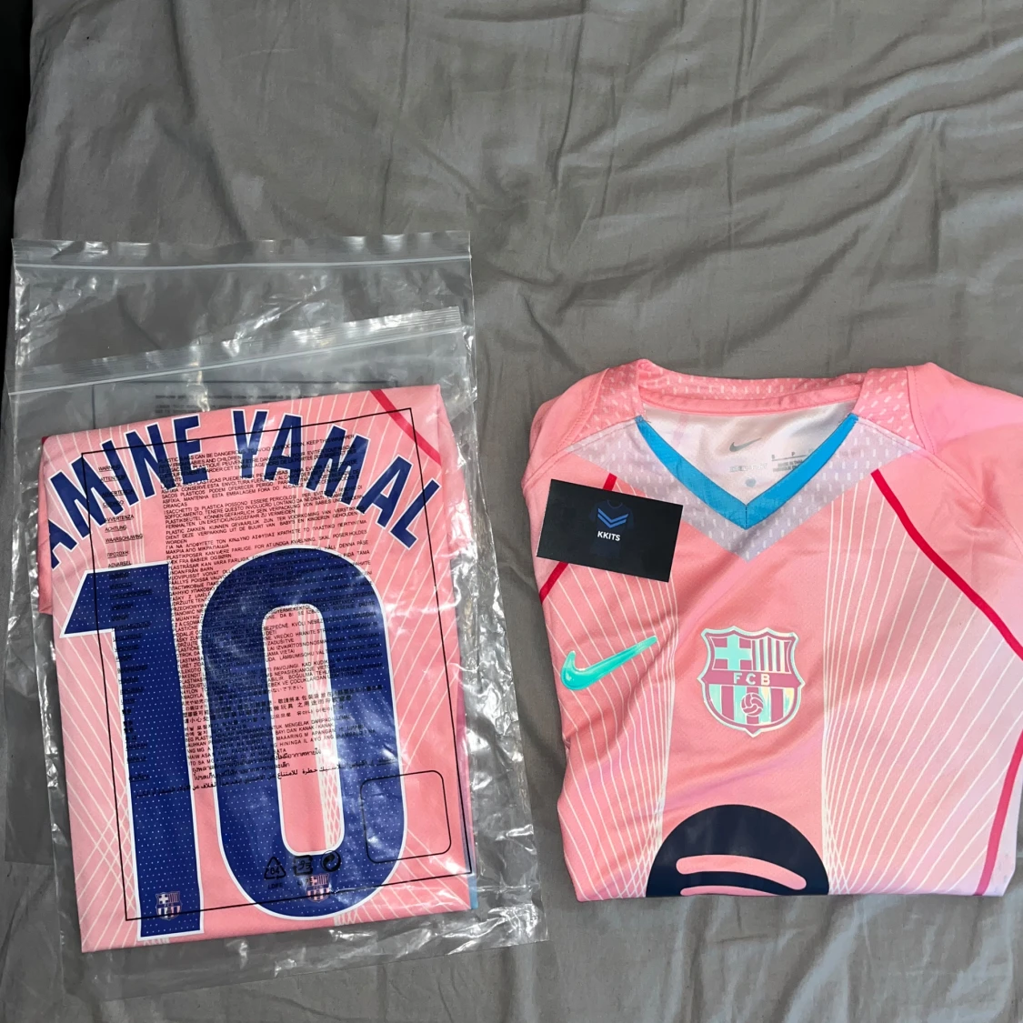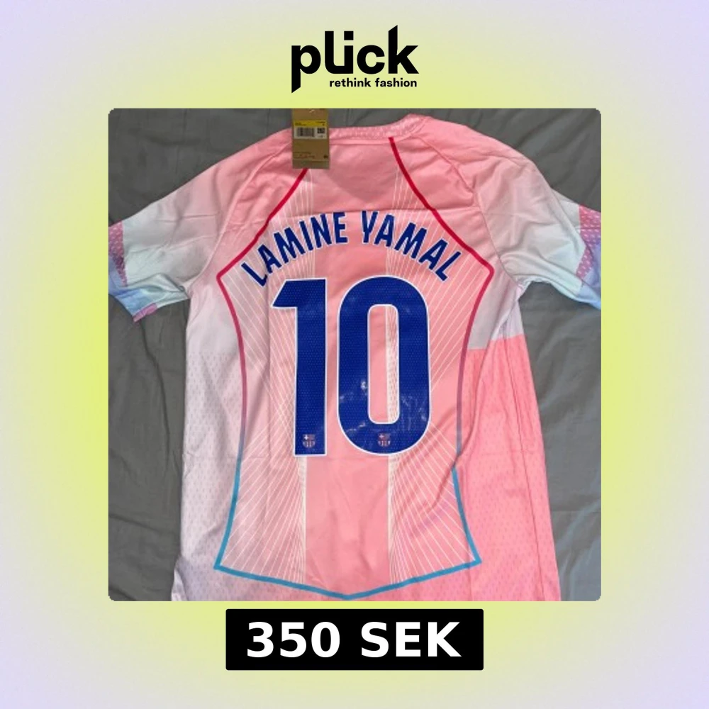Säljer en FC Barcelona fotbollströja med Lamine Yamal och nummer 10 på ryggen. Tröjan är rosa med vita och blå detaljer, har korta ärmar och V-ringning. Nike-logga, klubbmärke och Spotify som sponsor framtill. Tillverkad i lätt och ventilerande material. Har 2 stycken i storlek S