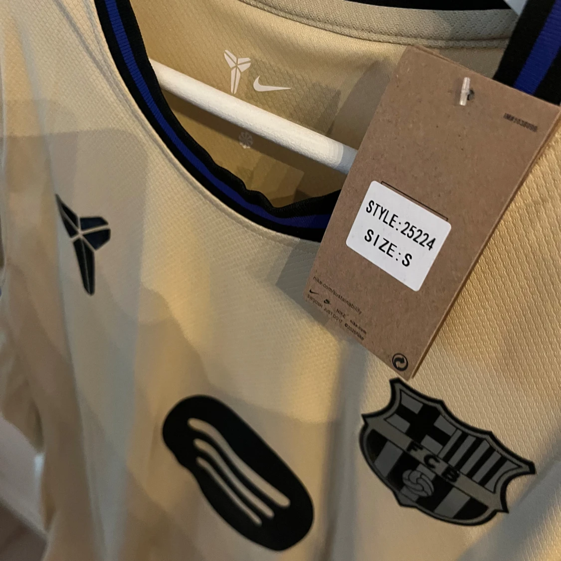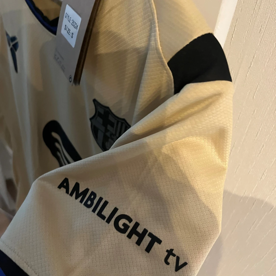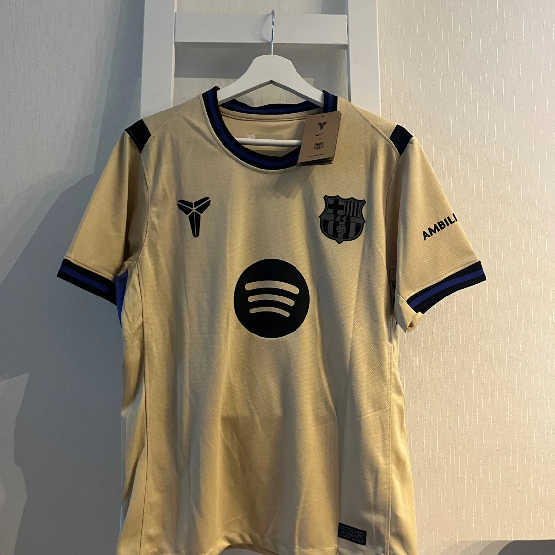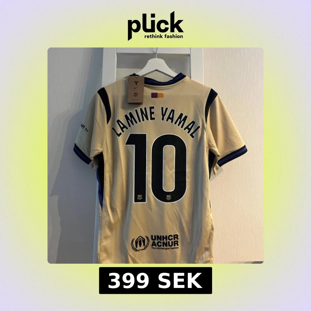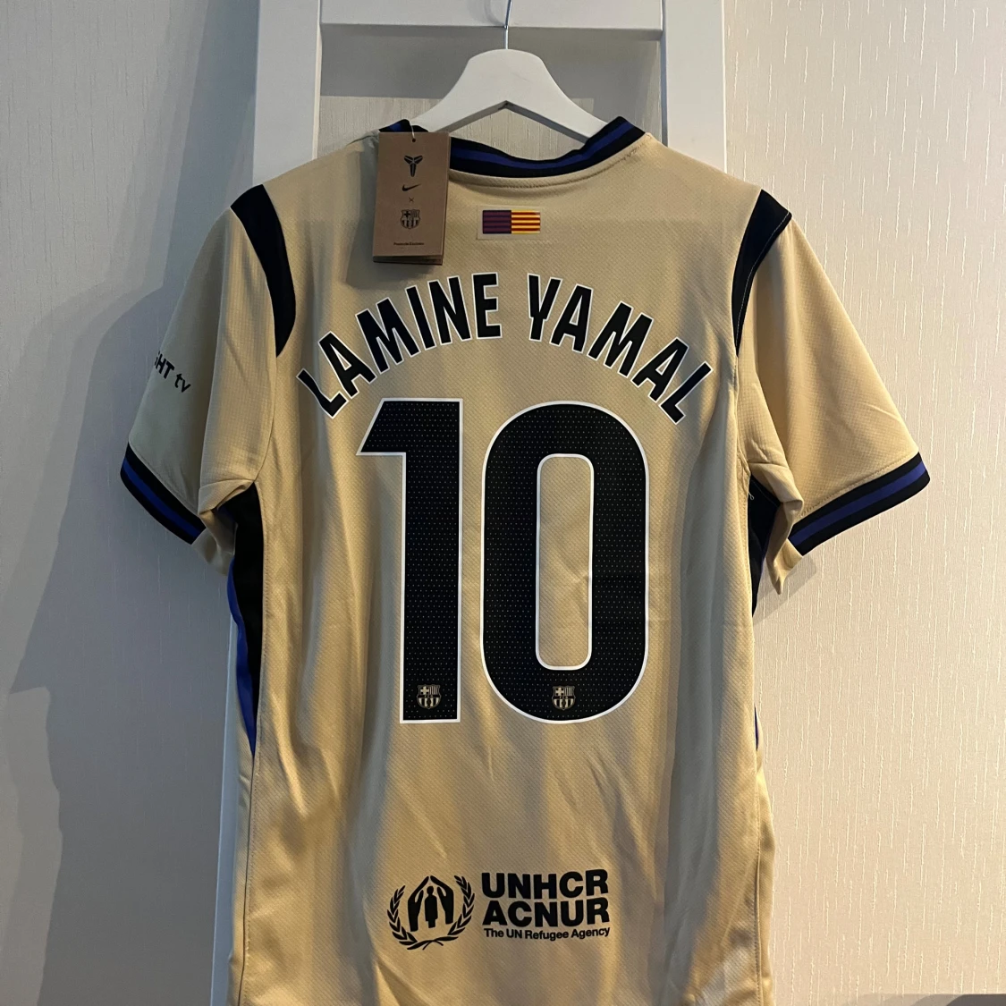 Snygg Barcelona fotbollströja med Lamine Yamal och nummer 10 på ryggen. Tröjan är beige med svarta och blå detaljer, officiella loggor från Nike, Spotify och UNHCR samt klubbmärke på bröstet. Tillverkad i lätt och ventilerande polyester.