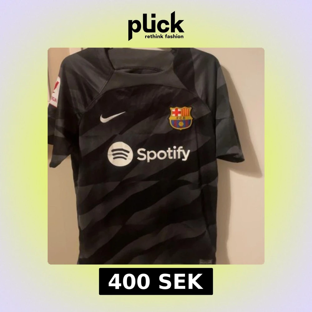 Säljer en svart FC Barcelona bortatröja från Nike med Spotify-logga på bröstet och klubbmärke. Tröjan har korta ärmar och subtilt mönster i olika nyanser av svart. Perfekt för dig som vill visa ditt stöd för Barca. Tröjan är aldrig använd. Skriv för funderingar eller frågor💯💯💯