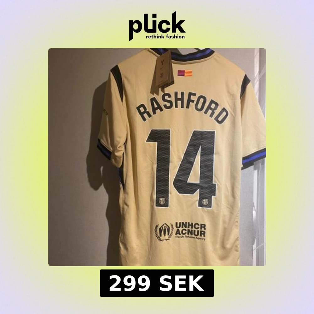 Exklusiv Barcelona fotbollströja med Rashford och nummer 14 på ryggen. Beige med svarta detaljer, FCB-emblem, Spotify-logga och UNHCR-tryck. Kortärmad med svart och blå krage, tillverkad i lätt polyester som andas. Perfekt för dig som vill sticka ut på planen.