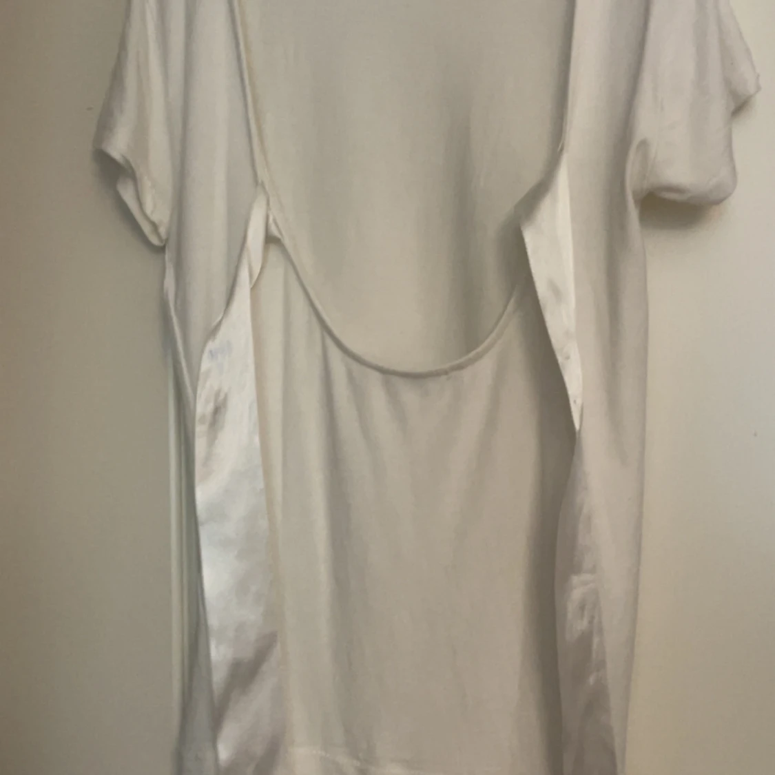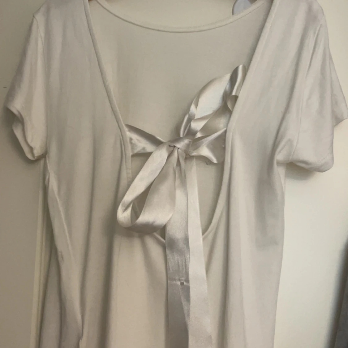 Säljer en vit t-shirt med rund hals. Tröjan har en snygg öppen rygg med en bred, glansig rosett i satin som knyts baktill hur man vill ha den. Materialet är mjukt och känns som bomull, perfekt för dig som gillar stilrena och enkla plagg med en söt design. Storleken är xs/s. Varan säljs på flera plattformar💕