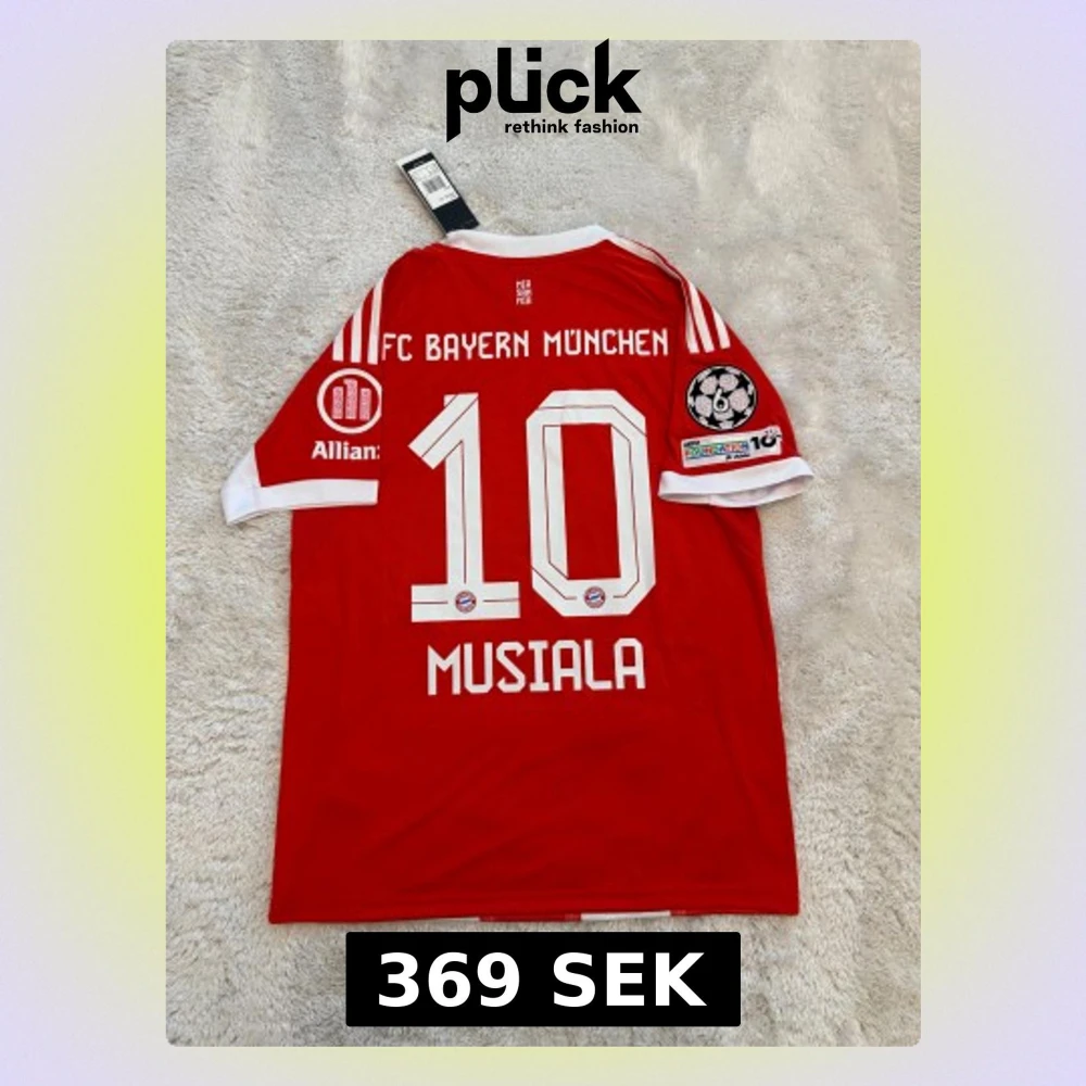 Säljer en officiell FC Bayern München fotbollströja från Adidas med Musiala och nummer 10 på ryggen. Tröjan är röd med vita detaljer, korta ärmar och klubbmärke på bröstet. Materialet är lätt och andas, perfekt för träning eller match. Champions League-märke på ärmen.