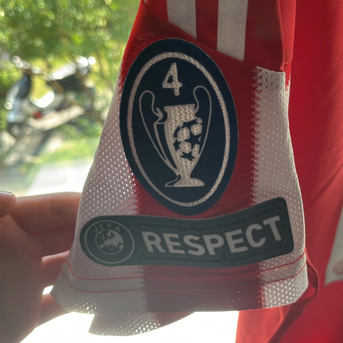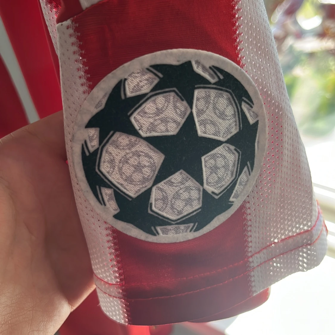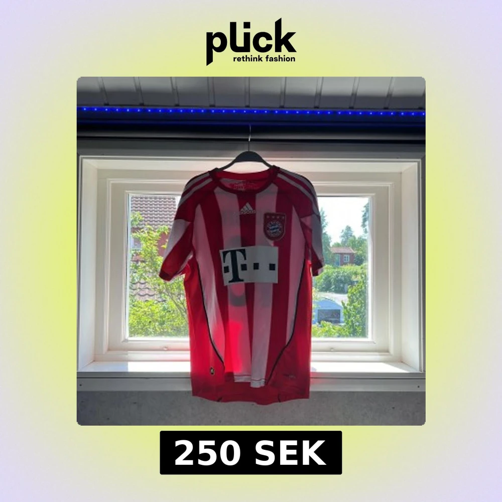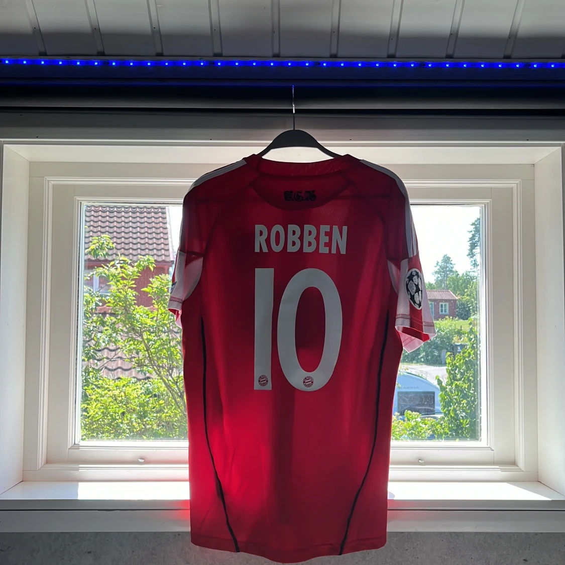 Säljer en klassisk Bayern München matchtröja storlek S med Robben 10 på ryggen. Tröjan är röd och vit med breda ränder, Adidas-logga och Champions League-patchar på ärmarna. Tillverkad i lätt och ventilerande material, perfekt för fotboll eller samling. Kom med frågor!!