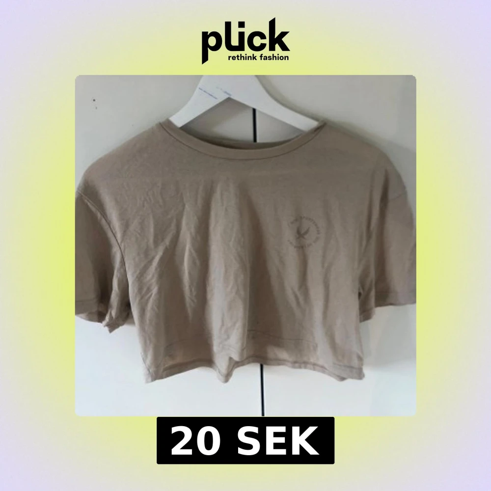Säljer en beige croppad t-shirt med rund halsringning och korta ärmar. Har ett litet tryck där fram men inget mer.