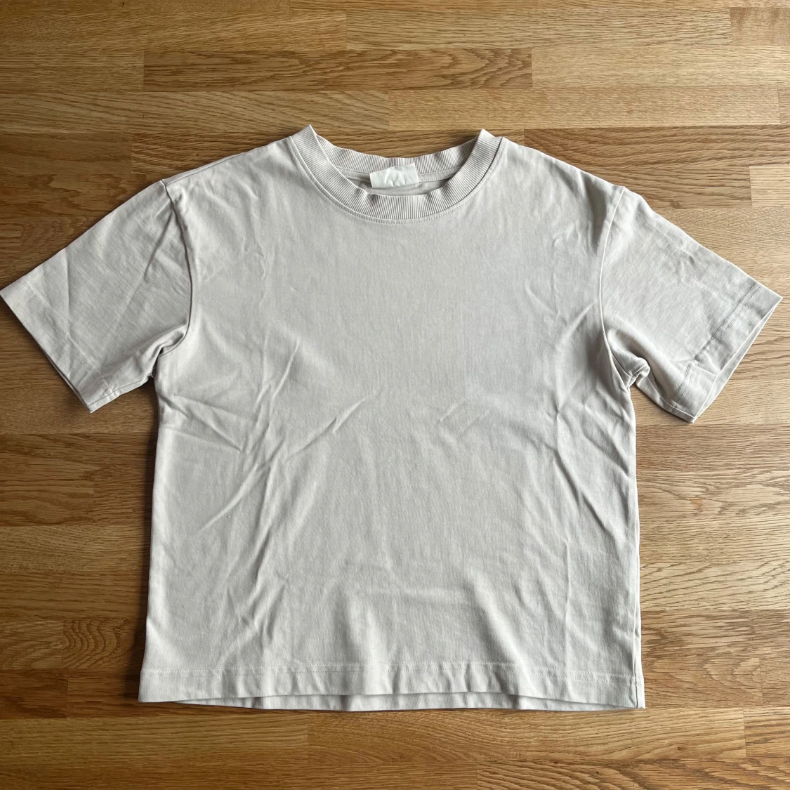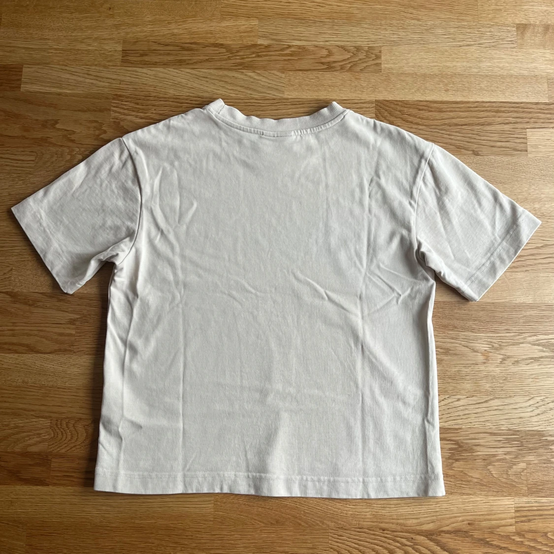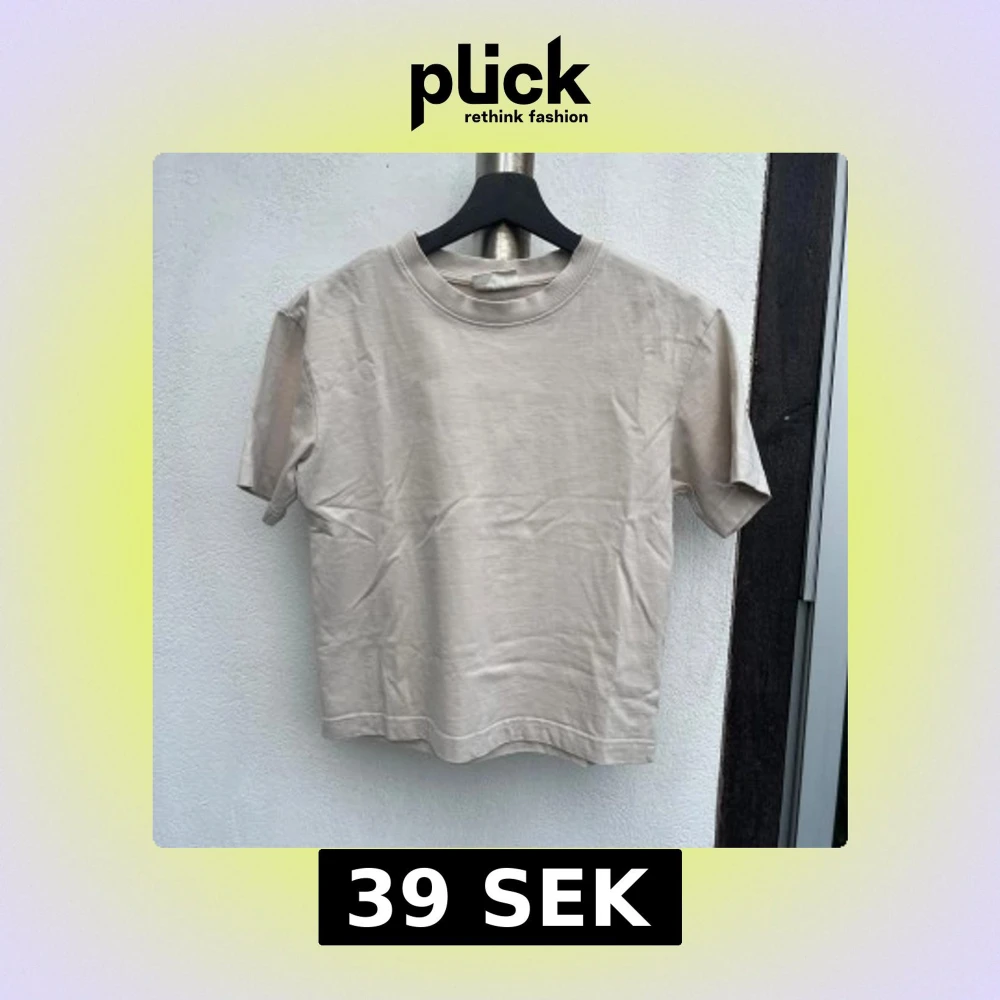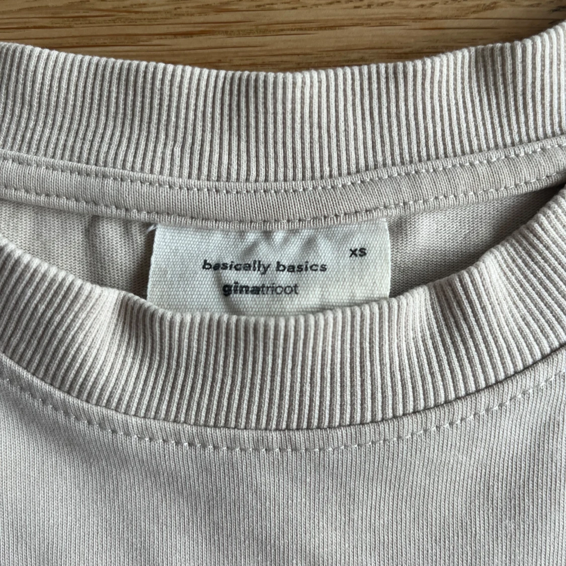 En vanlig basic beige t-shirt från Gina Tricot. Modellen är rak och har korta ärmar samt rund hals med ribbad kant. Materialet är mjuk bomull. Använd en del men fortfarande i fint skick. Storlek XS. (nypris 169kr)
