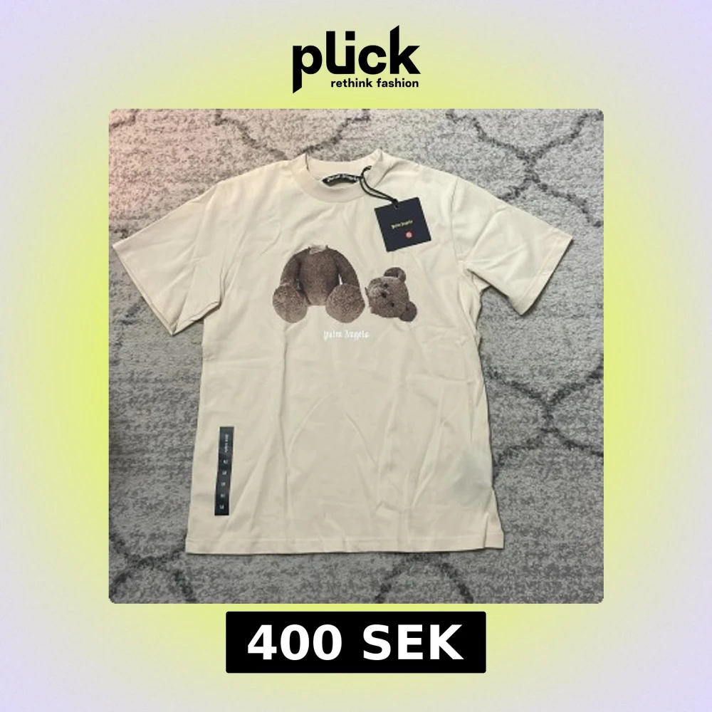 Snygg beige t-shirt från Palm Angels i bomull med ett stort tryck av en brun nalle på framsidan. Klassisk rund hals och korta ärmar. Palm Angels-loggan är tryckt under motivet. Perfekt för dig som gillar streetwear med en twist.
