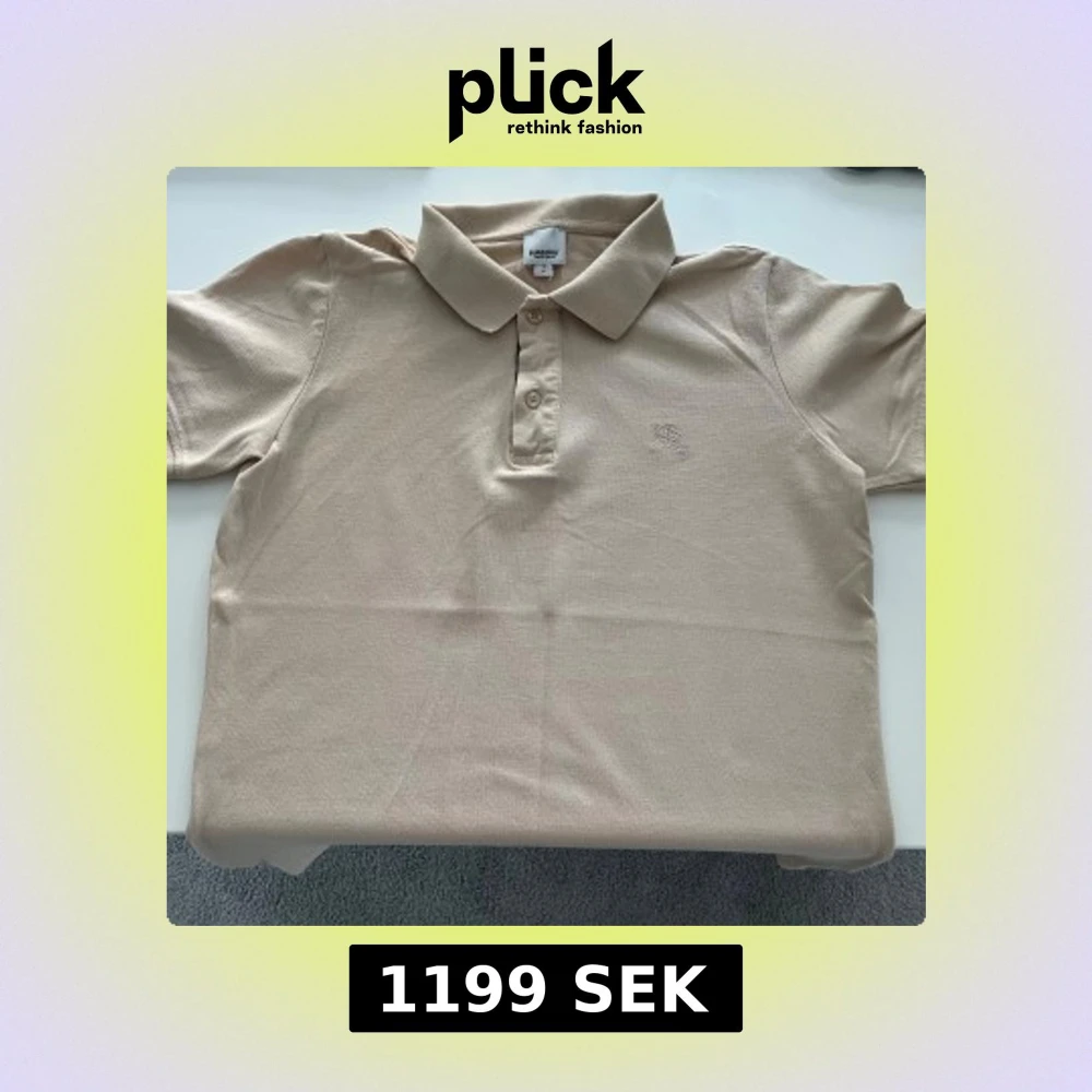 Säljer en stilren beige pikétröja från Burberry med klassisk krage och knappslå. Tröjan har korta ärmar och ett diskret broderat märke på bröstet. Insidan av knappslån har det ikoniska Burberry-mönstret. Perfekt för en avslappnad men elegant look. Använd 2-3 gånger.