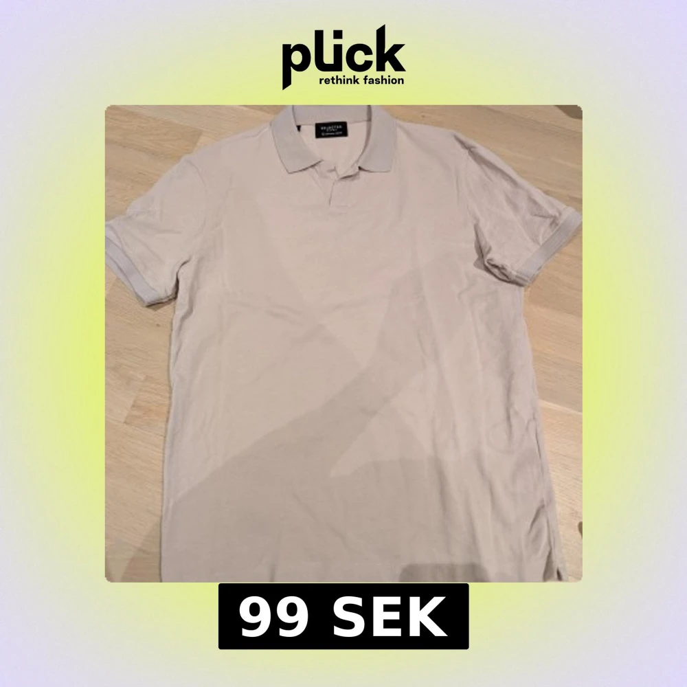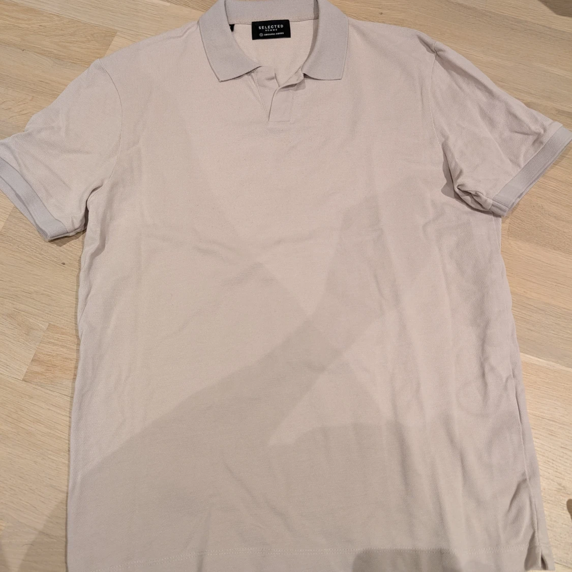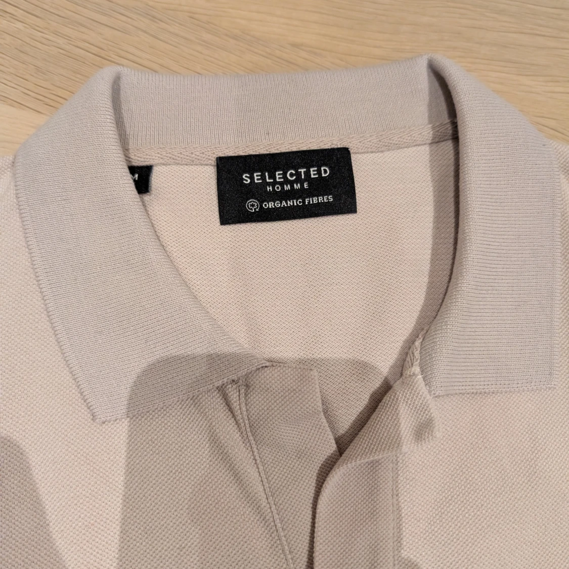 Snygg beige pikétröja från Selected Homme i storlek M. Perfekt för en stilren och avslappnad look. Tröjan har korta ärmar och en krage utan knappar.