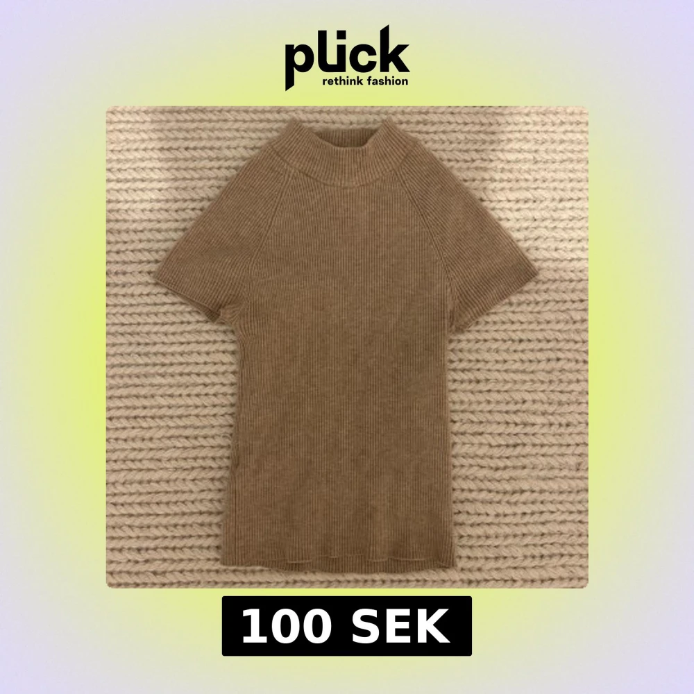 Säljer en stilren beige ribbad tröja med korta ärmar. Perfekt för en avslappnad look. Tröjan har en högre krage och är i ett mjukt material. Aldrig använd